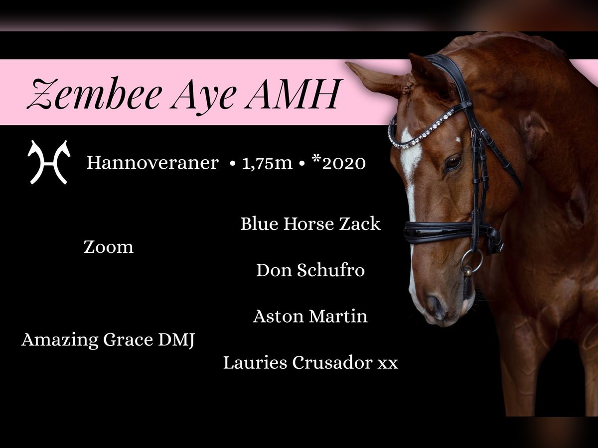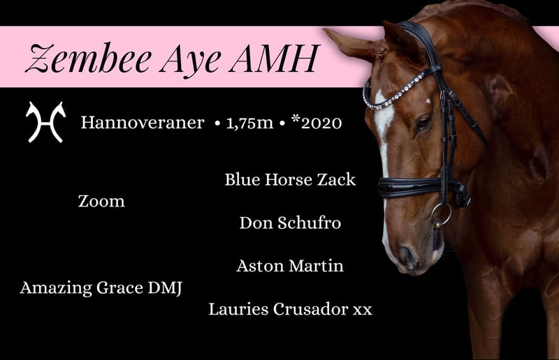 🎀 Zembee Aye AMH (DMJ Zealand) 🎀 Exceptional 5-Year-Old Hanoverian Gelding with a Golden Heart destined for top-level, also suitable for experienced children Age: 5 years (2020) Height: approx. 1.75 m Lineage: Zoom (Blue Horse Zack) x Aston Martin (Monteverdi) Training level: Placed in Dressage Horse A & L, started M (youngster) X-ray: Clear X-Ray images from this year available LOCATION: 976 31 Vlkanová (Slovakia) Zembee Aye AMH (DMJ Zealand) is a beautifully colored 5-year-old Hanoverian gelding who combines elegance, power, and an outstanding temperament. With his impressive presence and expressive movement, he is perfectly suited for riders aiming for the higher levels of dressage or those seeking a reliable and versatile partner for dressage or the jumping arenas. Competed successfully at 2nd Level Dressage (youngster) and training towards 3rd Level (youngster, clean changes), he shows remarkable willingness to learn and natural talent for extension. His balanced gaits, uphill canter, and rhythmic trot make every ride a pleasure. By the outstanding stallion Zoom (Blue Hors Zack) — known for producing rideable offspring with exceptional movement and trainability. Out of mare DMJ Amazing Grace, sired by the Grand Prix Trakehner stallion Aston Martin and descending from the famous Lauries Crusador xx damline, which also produced the legendary Wolkenstein I–III and Brentano I–II. This pedigree combines modern type, elegance, and proven performance genetics at the highest level. Dam line: https://www.horsetelex.com/horses/pedigree/1622329/dmj-amazing-grace Sire line: https://www.horsetelex.com/horses/pedigree/1623095/zoom Foal video: https://www.youtube.com/watch?v=L-twHc4O0Aw You’re welcome to reach out via WhatsApp at any time for questions or to arrange a trial ride. I’ll be happy to hear from you! 🎀 Tel: +421 950 522 899 🎀 amy@equinibrium.sk
