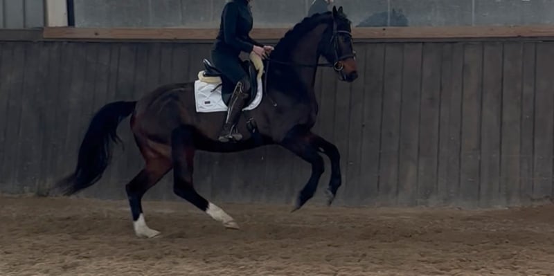 Finn stammt aus unserer eigenen kleinen Zucht und ist bei uns im Offenstall aufgewachsen. Er stammt ab von Foundation x Worldly I. Seine beiden Vollgeschwister sind siegreich bis S Dressur und bis S** platziert. Auch Finn bringt das nötige Vermögen hierfür mit. In der Dressur ist er derzeit bis A ausgebildet und befindet sich auch weiterhin in Ausbildung. Finn ist ein sehr ehrgeiziges und sensibles Pferd mit viel Go. Er möchte immer alles richtig machen, wird aber schnell nervös und spannig, wenn ihm etwas nicht gelingt. Entsprechend benötigt er einen erfahrenen Reiter, der viel Zeit und Geduld mitbringt, ihm die nötige Sicherheit vermittelt und klare Hilfen gibt. Auch am Sprung zeigt er viel Spaß und Talent. Er möchte immer auf die andere Seite und bringt hier ebenfalls viel Go mit. Bisher wurde er von uns bis A-Höhe gefördert und kennt auch Geländesprünge. Im Gelände zeigt er sich ebenfalls brav und entspannt. Neben der Arbeit unter dem Sattel wurde Finn auch vielseitig vom Boden ausgebildet. Besonders in der Freiheitsdressur und Zirzensik zeigt er viel Freude und macht hier unglaublich viel Spaß. Hier und auch im Umgang ist er ein absoluter Engel.