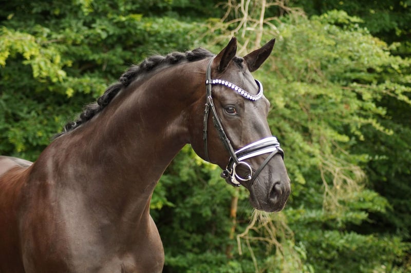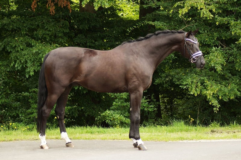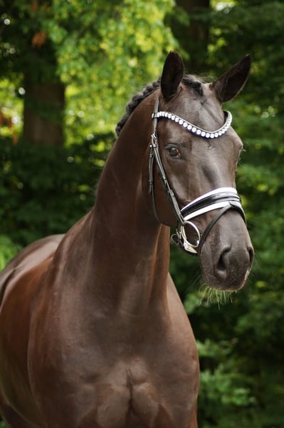 Quantez ist ein 6-jähriger Wallach von Quantensprung x De Niro. Der bildschöne Rappe ist aktuell siegreich in Dressurpferdeprüfungen der Klasse M und überzeugt mit seinen drei sehr guten GGA, seiner Rittigkeit und Einstellung. Hervorzuheben ist seine ausdrucksstarke Präsenz im Viereck. Mit viel Talent für die schwere Klasse bringt Quantez die besten Voraussetzungen für eine weiterführende Ausbildung bis Grand Prix mit. Erste Ansätze von Piaffe und Passage zeigt er bereits im Training. Ein ideales Pferd für ambitionierte Reiter, die in qualitätsvolles Nachwuchspferd mit Perspektive suchen.
