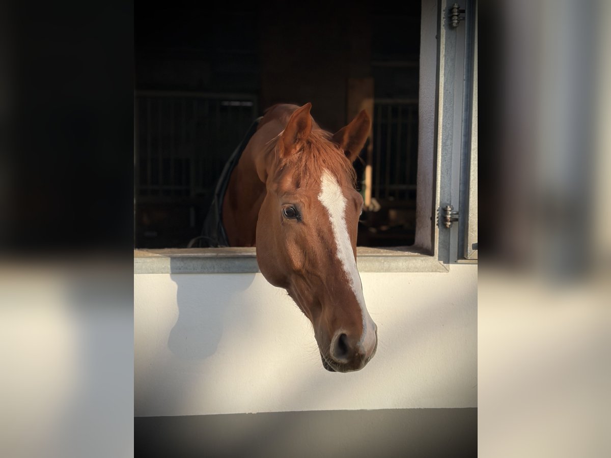 For sale is a stunning 8-year-old Hanoverian chestnut gelding (Vuccello x Chivas) with a lovable temperament. He possesses excellent movement but needs to be ridden regularly and primarily gymnastically trained due to his conformation (he’s the type of horse that looks good from below when it’s standing tall, but not necessarily in motion, so consistent gymnastic work is very important for him). Therefore, despite his gentle nature, he is not being sold as a beginner’s horse. Since he is quite well-behaved both in handling and under saddle, we initially purchased him for our advanced riding school with show jumping ambitions. We were actually looking for a reliable horse for jumping, and we found that in him. He always approaches the jump eagerly, is cautious, and wants to clear the obstacle, which also allows less experienced riders to shine. Unfortunately, it turned out that he is a rather sensitive horse that should be handled with calmness, patience, and understanding in daily work. He needs a consistent handler – frequent changes in riders, especially those still learning to gymnasticize a horse, are not suitable for him. He has already been very successful in competitions, winning both Jumping Horse classes A & L as well as regular L-level show jumping. Anyone who understands how to handle such a horse fairly will find a wonderful friend and sport partner in him. He is accustomed to box stall housing with all-day turnout in a herd, and it is important to us that he can enjoy this in his new home. Important: ❗️We purchased him from a dealer, so we do not know his full history – he was somewhat nervous or skeptical when tied in the stable aisle for grooming, tacking up, etc. ❗️No sales to riding schools.