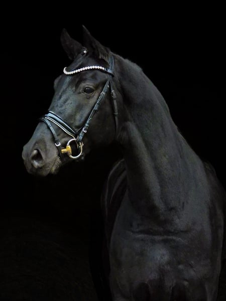 A stunning black gelding, born in 2018, with striking looks, charm, and presence. This Hanoverian is ideally suited for dressage and impresses with his elegant appearance and pleasant temperament. He has three exceptional basic gaits. Well-trained, eager to perform, very rideable, and completely straightforward. Placed in dressage competitions. For more information, please contact us at 0171/5477697.