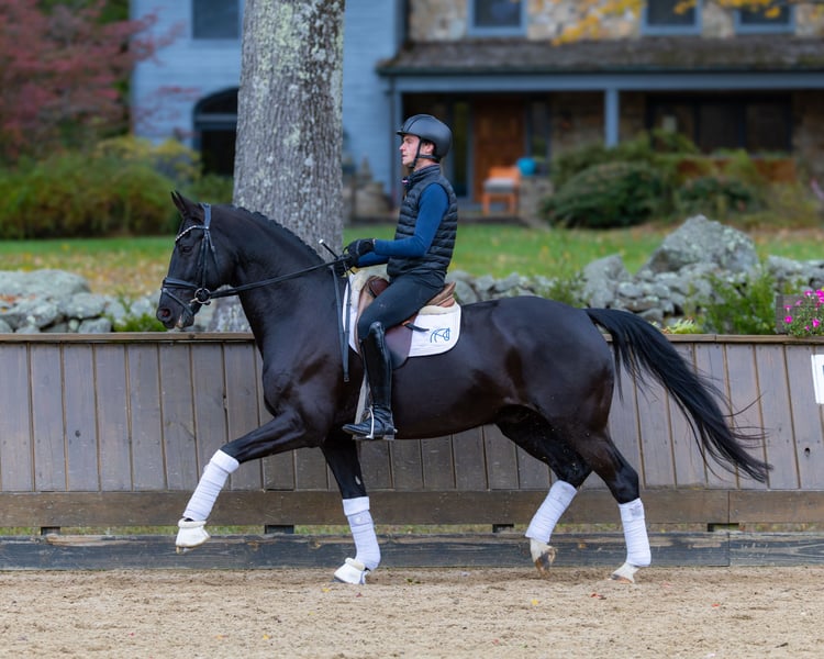 This black, unpolished diamond is by the world-renowned stallion Glamourdale, known for producing modern dressage horses with stunning gaits, excellent rideability, and strong competitive instincts. Gentleman embodies his pedigree, with energetic impulsion, perfect balance, and a positive, willing attitude - his walk and canter are exceptional. He has already successfully competed in 4-year-old classes in 2025, showcasing his talent. If you are looking for a young horse with a bright and promising future, Gentleman is the one for you!