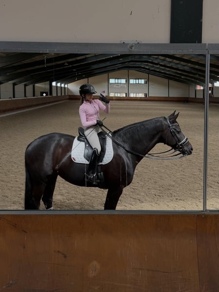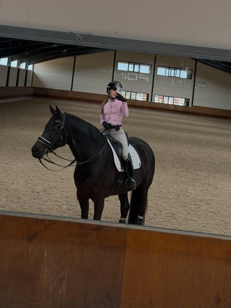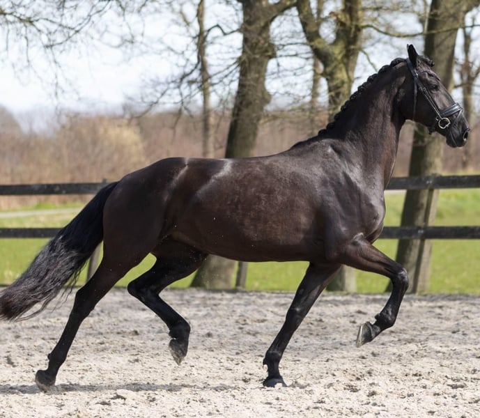 Ein außergewöhnlich attraktiver, komplett schwarzer Hannoveraner Hengst, der sowohl im fortgeschrittenen Springsport als auch in der höheren Dressur hervorsticht. Dieses elegante Sportpartner fällt sofort durch sein harmonisches Exterieur, seine kraftvolle Erscheinung und seine hervorragende Rittigkeit auf. Der Hengst verfügt über ein korrekt gebautes Fundament, eine starke und gut entwickelte Hinterhand sowie eine schulterfreie Bewegung, die ihm optimale Bewegungsfreiheit sowohl im Parcours als auch in der Dressur ermöglicht. Seine Grundgangarten sind von hohem Niveau: ein großzügiger, sauberer Schritt, ein elastischer und ausdrucksvoller Trab mit viel Impuls aus der Hinterhand sowie eine gut getragene, bergauf gesprungene Galoppade, die sich hervorragend für höherklassiges Training eignet. Im Springen zeigt er viel Vermögen, eine sehr gute Technik und ein scharfes Auge für die Sprünge. Er springt mit Abfuhr, Vorsicht und Übersicht. In der Dressur überzeugt er durch seine Arbeitsbereitschaft, feine Anlehnung und sein Vermögen zur Versammlung. Daher ist er ein idealer Partner für Reiter mit Ambitionen im höheren Sport. Charakterlich ist er zuverlässig, arbeitswillig und ausgeglichen. Er bleibt fokussiert im Training und verfügt über ein stabiles Temperament, was ihn auch für erfahrene Amateur- oder ambitionierte Reiter geeignet macht. Besonders hervorzuheben ist sein ausgezeichneter Gesundheitszustand: alle veterinärmedizinischen Untersuchungen, inklusive aktueller Röntgenaufnahmen, sind vollständig in Ordnung und ohne Befund. Der Hengst ist einsatzbereit für den direkten Einsatz im Sport. Ein Pferd mit außergewöhnlichen Qualitäten, das durch Talent, Einstellung und Ausstrahlung überzeugt.