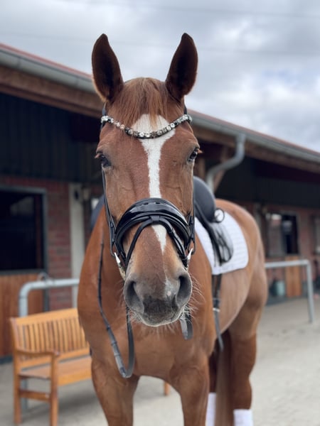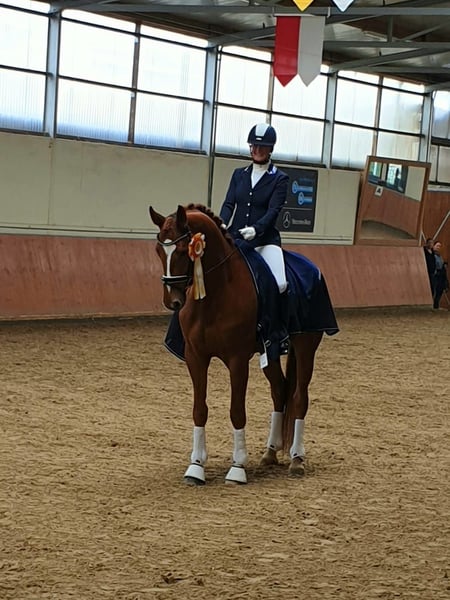 I am selling my stunning 9-year-old Hanoverian dressage gelding, "Bernstein," who impresses not only with his elegant appearance but also, above all, with his excellent character. Bernstein has three very good basic gaits, which delight both in the arena and during daily training. He is a multiple winner in Dressage Horse Classes A and L, receiving high scores, and has also successfully competed in two Dressage Horse M tests with scores in the 7s range. I am offering him intentionally as a top-class A- and L-level dressage horse with potential for small M-level competitions. He finds the higher degree of collection required for the upper classes a bit more challenging – but he makes up for it with his charisma, rideability, and consistently high ratings in the A- and L-levels, where he regularly scores in the 8s. ✨ What makes him special: - Absolutely well-behaved and easy to handle - Very people-oriented and integrated into the family - Experienced with children and always reliable - Safe in the terrain and relaxed outside the arena - Farrier- and loading-friendly - Excellent health condition He is a horse that will bring great joy to both ambitious competitors in the show ring and a loving family seeking a reliable partner. 💛 Important: I am only offering him to the very best hands, as he is a family member to us. It is very important to us that he receives close family connection in his new home as well. If you are looking for a dependable, successful, and heartwarming dressage partner, I look forward to hearing from you! 🐴✨
