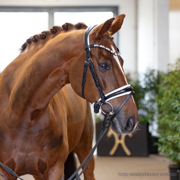 The versatile mare Dilana has already foaled a high-quality foal by Viva Gold at the age of five. She impresses both through her breeding value and her own performance. Despite a training gap at the time, the 11-year-old mare has been achieving M-level placings since 2022 and consistently performs the major components of the advanced class in work at home. She has not yet been presented in S-class at competitions under her ambitious trainer Constanze Möller, but overall, Dilana has been used in a planned manner at shows. Thanks to her positive rideability, clear mind, and always positive work attitude, Dilana suggests that her final level of confidence in the movements will be achieved soon and that she can be reliably ridden by different rider types. Her physique, within a medium frame, makes her ideal for junior riders and re-entrants with high standards. By the way: she enjoys a break on the racetrack or free movement in the pasture after work, which she finds very enjoyable.