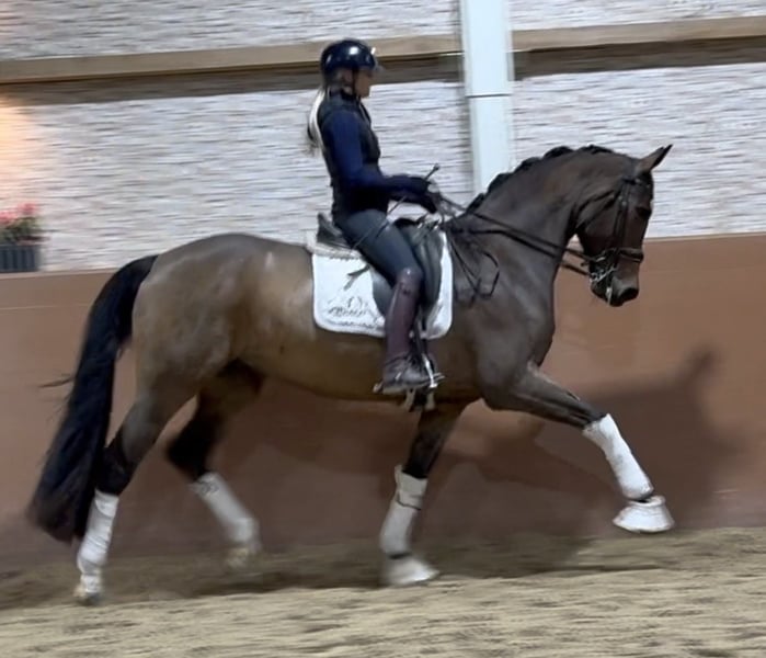 Liebe Interessenten, Für Terminvereinbarungen Probereiten senden Sie mir bitte eine WhatsApp. Für weitere Fragen bin ich tagsüber per WhatsApp erreichbar, telefonisch erreichen Sie mich am Besten zwischen 16 und 19 Uhr. Ich freue mich auf eine Kontaktaufnahme www.angelina-devittorio.de ⭐️Frieda⭐️ Alter: 11 jahre (2014) Größe: 1,68 m Abstammung: Fidertanz x Sandro Hit Ausbildungsstand: M* Niveau AKU: gute AKU incl Röntgenbilder vorhanden Zum Verkauf steht eine traumhaft schöne, 11-jährige Tochter des Fidertanz, die sich mit ihrer wunderschönen Optik und liebenswerten Charakter sofort ins Herz spielt. Dieses Pferd überzeugt nicht nur durch ihren lieben Charakter, sondern auch durch ihre hervorragende Grundqualität . Sie ist sehr angenehm zu reiten und vermittelt ihrem Reiter stets ein tolles sicheres Reitgefühl. Im Training zeigt sie sich sehr lektionssicher auf M* Niveau und arbeitet immer gerne mit. Super angenehm zu sitzen und fein in der Hand, auch auf Trense traumhaft schön zu reiten. Dazu mit genügend angenehmen Go ausgestattet . Dabei macht sie einfach jeden Tag Freude – ob in der täglichen Arbeit oder auch im Gelände. Hier ist sie auch super brav und abgeklärt Die Besitzer wünschen sich ein neues Zuhause und möchten sie gerne in liebevolle Hände geben. sie ist sofort in der Klasse L & M* einsatzbereit. Im Gelände zeigt sie sich brav und zuverlässig, im täglichen Umgang ist sie verschmust, freundlich und einfach ein echtes Herzenspferd. Sie möchte ihrem Menschen gefallen und ist eine treue Partnerin, die ihre zukünftigen Reiter – insbesondere jene, die Freude an feinem Reiten und einer harmonischen Partnerschaft haben – rundum glücklich machen wird. Gute AKU incl Röntgenbilder liegen vor. ⚜️Tel: 0171-3438949 ⚜️a.devittorio@web.de ⚜️https://www.ehorses.de/angelinadevittorio Facebook und Instagram Angelina De Vittorio