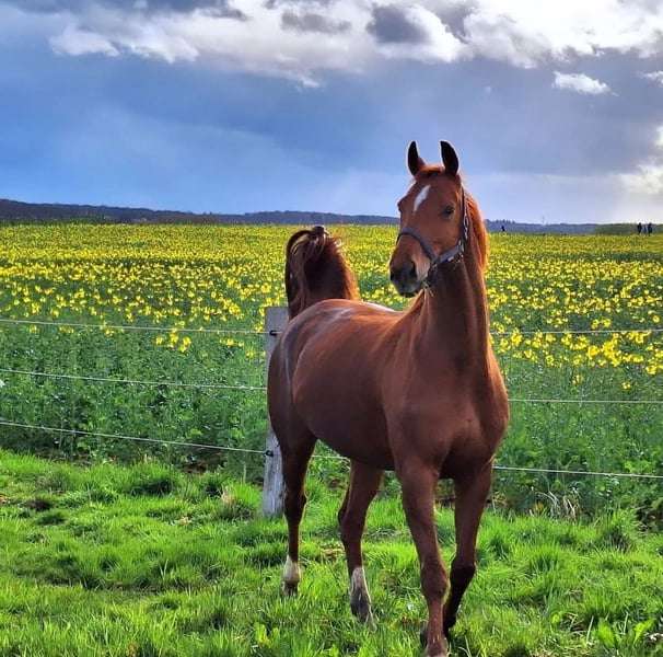 I am looking for a wonderful new home for my mare, preferably as a final destination. She has been with me for five years and has always been a true treasure! However, she needs her own person! She goes everywhere with me and does everything for me—whether dressage, jumping (though she has had little training in that), trail riding, groundwork, hacking, competitions, or seaside holidays... she enjoys it all! She has given me two wonderful foals and is currently registered as a breeding mare. At the moment, she is not in training and is therefore offered at a significantly reduced price (she will be trained again soon). Although my son and even beginners can handle her, she is not suitable for novice riders! Please only serious inquiries! No dealers or commercial interests.