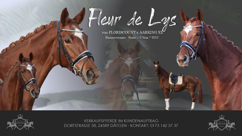 LEICHTRITTIGE, SCHÖNE & LIEBE DRESSUR LEHRMEISTERIN MIT TYP UND GANG - PLATZIERT - 5 FOHLEN - PSG NIVEAU - PIAFFE - Junioren geeignet! Zum sofort Lostreiten! Zum Verkauf steht, in Vertretung des Besitzers, diese, mit auffälliger Mechanik ausgestattete, 13 j., platzierte, Zucht erfolgreiche, 174cm große, hannoveraner dunkelfuchs Stute mit leistungs- und härte-geprägter Abstammung von FLORISCOUNT x AARKING XX. "Fleur de Lys" konnte sich bereits als Jungpferd auf dem Turnier in starken Starterfeldern behaupten und kann platzierungen in Dressurpferdeprüfungen der Klasse A (7,2) über L (7,5) bis M (7,8 / 3. Platz) vorweisen. Aufgrund Ihrer modernen Abstammung, dem harmonische Gebäude und dem guten Interieur, wurde Sie daraufhin in der Zucht eingesetzt und brachte 5 sehr gelungene Fohlen. Sie steht im Hannoveraner Hauptstutbuch. Wieder in Arbeit unter dem Sattel, ist diese Stute immer Leistungsbereit, zeigt spielerisch ihre bereits vor Jahren ernernten hohen Lektionen, ruft diese schnell ab und erfeut sich an der täglichen Arbeit. Sie ist in der Arbeit unerschrocken, abgeklärt, leichtrittig, fehler verzeihend und mit feiner Anlehnung bei guter Selbsthaltung - daher ist Sie absolut Juniorengeignet und eine tolle Lehrmeisterin. "Fleur de Lys = Lilie" ist wie Ihr Name schon verrät, wunderschön und weiß mit typvollem Gesicht, harmonischem Gebäude und wirklich tollem Seitenbild zu imponieren. Mit Ihrer Abgeklärtheit und einem Herz aus Gold, bereitet Sie einem im Umgang und in der täglichen Arbeit immer Freude. Die Tatsache, das Sie mit 13j. und 5 Fohlen, bereits alle S* / PSG Lektionen, sowie die meisten INTER I Lektionen, sowie PIAFFE beherrscht, beweißt Ihr hohes maß an Rittigkeit; Leistungs-, Ausbildungsbereitschaft und freude am Sport. Setzt sich "Feur" in Bewegung, zeigt sich eine leistungsbereite Sportlerin mit freude am großen Gang. Sie besticht durch Ihr auffällig schönes Seitenbild, mit guter Selbsthaltung und natürlicher Aufrichtung. Dadurch entwickelt Sie die Schwunghaften Gangarten mit viel Mechanik, Einkelung und Knie toll ins Bergauf, mit auffällig freier Schulter und gut heran geschlossener Hinterhand. Ihre feine Anlehnung und gute Rückentätigkeit machen es dem Reiter leicht, "Fleur" mit feinen Hilfen zu bedienen. Wer also ein LEHRMEISTER, aber auch eine liebe FREUNDIN zum Schmusen sucht, der ist bei "Fleur" genau richtig. Eine echte gelegenheit ein tolles Pferd zu erwerben. Gerne kann "Fleur" nach dem Kauf auch bei uns im professionellen Beritt verbleiben und auch auf Turnier vorgestellt werden. Ein aktueller, guter, klinischer und röntgenologischer (Standart + Rücken) TÜV liegt vor.