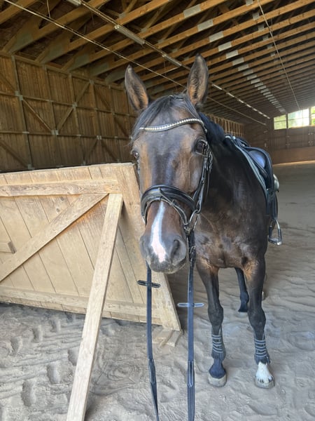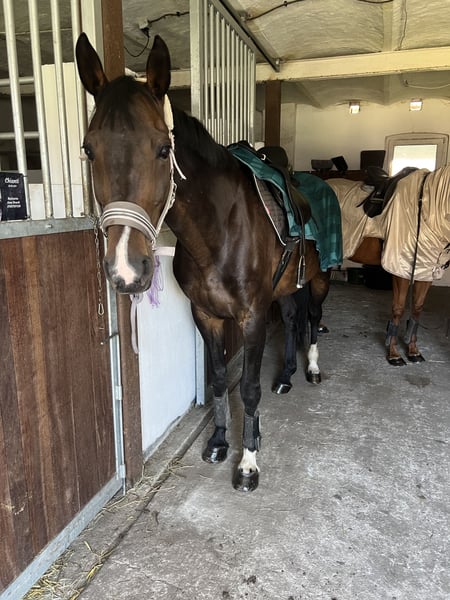 Chianti – Jument Hannoverienne, 14 ans - Origine (dernière photo) Chianti est une jument Hannoverienne d’environ 1,69 m, qui séduit non seulement par son allure élégante, mais surtout par son tempérament exceptionnellement affectueux et proche de l’humain. Ceux qui la rencontrent remarquent immédiatement : cette jument est un véritable ange. Au quotidien, Chianti se montre extrêmement amicale, douce et fiable. Elle est facile à charger, ferrée, sûre en circulation et facile à manipuler. Elle est déjà ferrée à l’avant. Chianti a déjà acquis de l’expérience en troupeau, elle occupe une position plutôt basse dans la hiérarchie et s’adapte bien. Elle a passé plusieurs années chez Schockemöhle en tant que jument de reproduction dans un grand groupe. Sous la selle, Chianti se trouve au niveau A. Elle est confortable à monter, agréable à la selle et travaille avec motivation. Elle connaît aussi bien un saut d’obstacles qu’une selle de dressage et se laisse monter agréablement avec les deux. À noter : elle n’a jamais piaffé et se déplace sans problème en liberté dans le terrain, ce qui fait d’elle une monture fiable même pour des cavaliers moins expérimentés. Elle aime aussi faire de petits sauts avec vous. Elle adore aller en forêt et apprécie le temps passé avec son cavalier. On peut aussi simplement faire une promenade en halter et longe ou la longéer. Chianti ne peut plus être utilisée comme cheval de compétition en raison de ses capacités physiques, mais elle convient parfaitement comme cheval de loisir fiable et jument de reproduction. Elle cherche une place aimante, idéalement en paddock, où elle pourra profiter de ses dernières années de vie et continuer à apporter de la joie. Elle préférerait être régulièrement sortie en balade à l’extérieur. Chianti est un cheval qu’on aime dès le premier instant – fidèle, doux et doté d’un incroyable attachement à l’humain. Elle mérite tout simplement ce qu’il y a de meilleur ❤️ En cas d’intérêt sérieux, je peux également envoyer des vidéos.