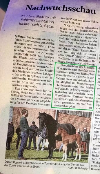 Zu verkaufen ist unsere 1 ,5 jährige Dressurnachwuchsperle Samira (geboren März 2024). Ihre Dressurabstammung lässt nicht zu wünschen übrig mit u.a. Belissimo M, His Highness, De Niro, Secret und Don Schufro. Auch ihre Urgroßmutter Carmina Burana, die 3 jährige Bundessiegerstute gewesen ist, findet sich in Samira wieder. Sie ist immer artig, menschenbezogen und unkompliziert. Liebt es auch von Kindern bespaßt zu werden und auch Kuscheleinheiten sind sehr willkommen. Sie ist regelmäßig geimpft (Tet/Infl), entwurmt und Hufe gemacht. Sie steht bei uns in einer gemischten Stutenherde ganzjährig draußen (Winter Offenstall / Weidezelt) und spielt gerne mit den anderen Jungspunden in unserer Herde. Ihr geschätztes Endmaß liegt zwischen 165 und 170 cm. Sie wurde bereits auf der Fohlenschau für ihre guten GGA, Taktsicherheit und Elastizität gelobt. Lassen Sie sich bei einem persönlichen Kennenlernen von dieser tollen Jungstute bezaubern. Sie wird nur abgegeben, da wir noch eine Vollschwester haben. Gerne einfach melden unter: 0176-78879276