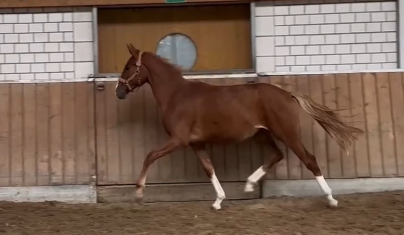 This expressive chestnut mare by Maxim x Dannebrog x Pik Bube impresses with her correct conformation, strong bones, and already well-developed, harmonious physique. "Mylady" is a particularly attractive yearling chestnut mare with a light, almost blonde mane and a friendly, open demeanor. She is consistently well-behaved in daily handling, halter-trained, and has mastered the basics of foal training. In movement, she displays a lively, rhythmic trot with plenty of cadence and natural balance. A charming young mare with excellent potential for a future career in sport or breeding.