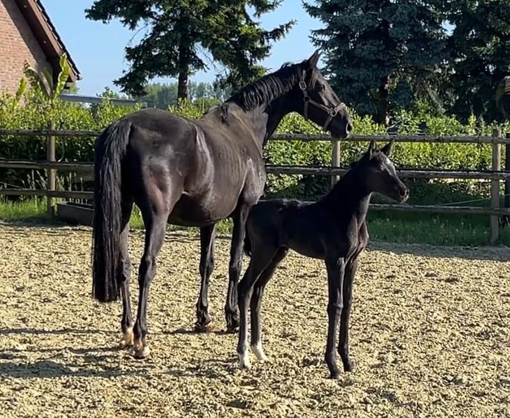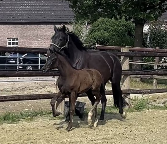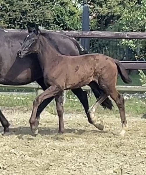 Onze Sweet Glamour draagt haar naam met recht. Een echt mooi merrieveulen uit een uitstekende dressuurstam, zal ze een statement maken in de bak. Ze is geboren op 02-05-25. Haar vader Sarai L (Secret x For Romancier) valt op door schoonheid en vermogen in zijn zwarte jas. Haar moeder (Glamourdale x Donnerhall x Pik Bube I) verenigt het beste in zich en heeft een krachtige bouw. (Zou eventueel ook te koop staan. 3 jaar oud, onder het zadel en heeft 2 veulens gehad.) Sweet Glamour verenigt dit alles, inclusief een geweldig, mensgericht en zeer aanhalig karakter. Op de eerste video is de mooie dame 4 dagen oud en de andere video is gemaakt op 21-07-25.