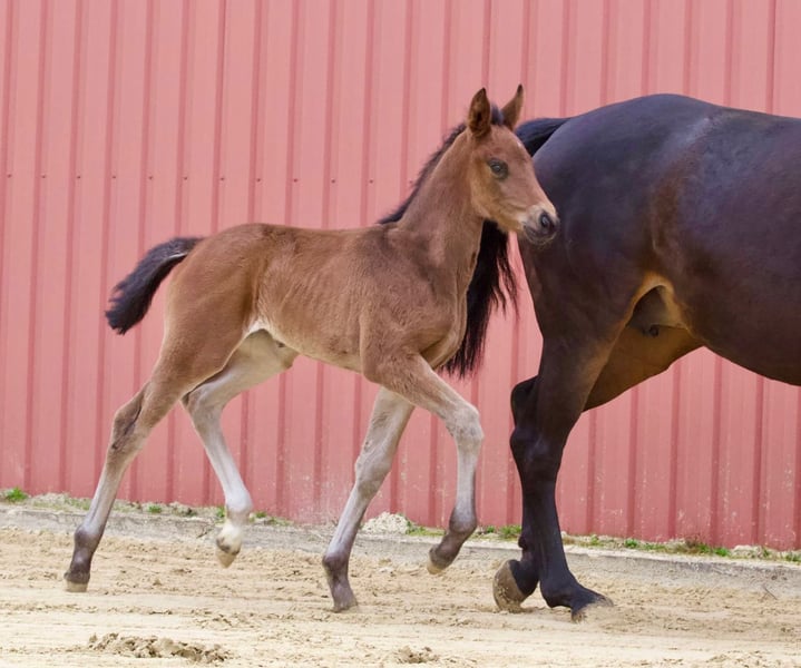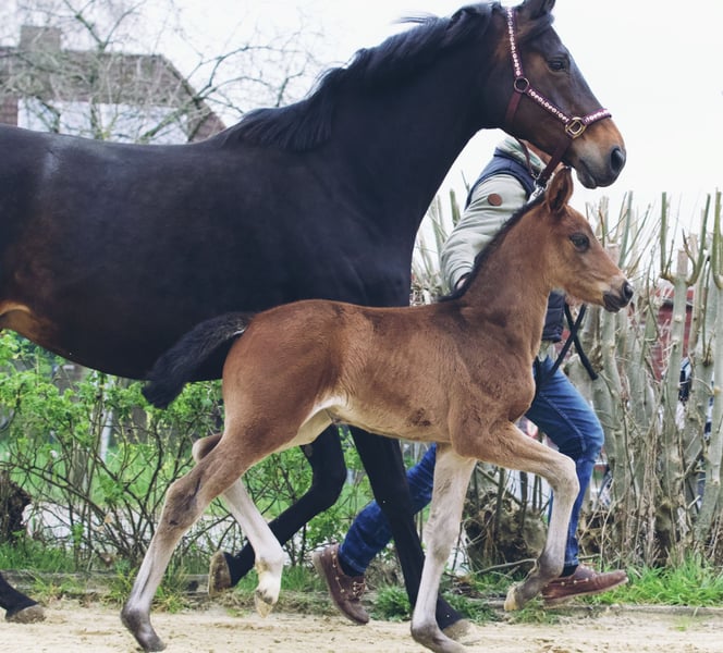 Prachtig merrieveulen uit een Hannoveraanse topmerrie van Sarotti Mokka Sahne, die erg gericht is op mensen. Bonna Mia staat correct en beweegt zeer goed in alle 3 de gangen. Bonna Mia komt uit de moederlijn van Piccola, een zeer goed gefokte stam met 63 geregistreerde staatspremiemerries en goed oud Hannoveraans prestatiebloed. Haar moeder is een premie merrie in de 7e generatie.