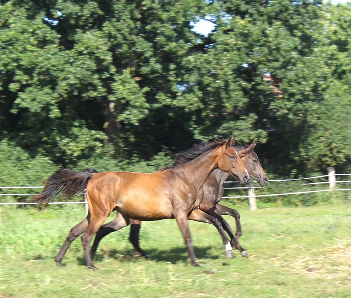 Quäntchen Glück to typowa, ruchliwa klacz roczna o przyjaznym i towarzyskim charakterze. Ojciec Quintessential został zwycięzcą testów hodowlanych w wieku 3 lat, wiceczempionem krajowym oraz uczestnikiem Bundeschampionatu, a także dziadek Danone II przekazuje najlepsze geny do ujeżdżenia z linii Donnerhall / Weltmeyer. W rodowodzie matki można znaleźć Marlesko xx i Adler, co zapewnia wytrzymałość i zdolności skokowe. Dlatego jest podwójnie utalentowana i ma wszystko, co potrzebne, aby być koniem rekreacyjnym, ale także odnoszącym sukcesy koniem na zawodach w ujeżdżeniu i wszechstronności. Bezpośrednio od hodowcy.