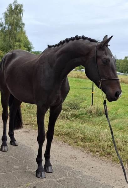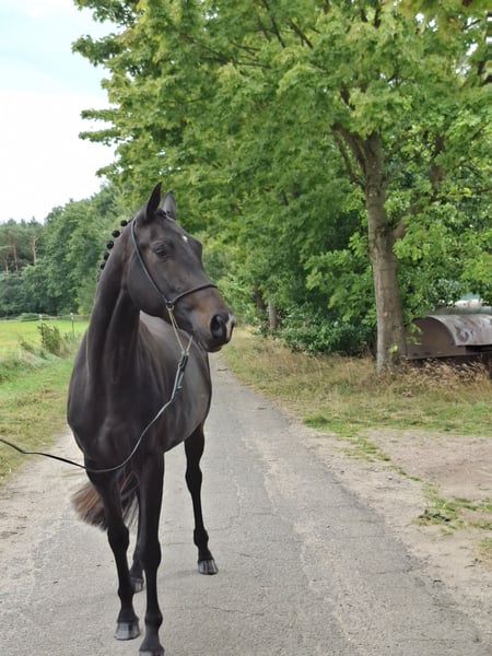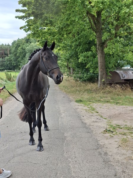 Elegant Hanoverian mare for sale – perfect for breeding and leisure! This beautiful dark bay Hanoverian mare was foaled in 2022 and impresses with her charming appearance and promising pedigree. Currently standing at 16.2 hh, she combines size and grace, making her ideal for ambitious breeders or riders who value quality. Unfortunately, she had a pasture accident which resulted in osteoarthritis in her left hind fetlock. At present, a gait irregularity in her trot can be observed. More details can be provided via private message. Sunny is absolutely well-behaved and mentally sound. She is open to everything and an entirely honest horse. Coming from a maternal Trakehner lineage, she is very people-oriented and loves all kinds of activities. I can also imagine her excelling in groundwork. Feel free to contact me with any questions or interest!