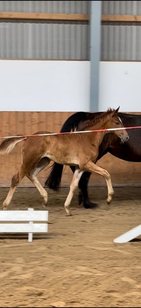 ✨ Uitstekende merrie uit een beproefd Olympisch bloedlijn Een echt juweel voor veeleisende fokkers en ambitieuze ruiters: Deze karaktervolle merrie, geboren in 2023, combineert moderne sportiviteit met een van de meest invloedrijke moederlijnen uit de Duitse warmbloed fokkerij. Afstamming: Ellis x Danone x Romancier Verwacht eindmaat: circa 1,65 m Ze overtuigt nu al door haar correcte fundament, harmonieuze uitstraling en drie bovengemiddelde basisgangen. Vooral haar elastische beweging, actieve achterhand en natuurlijke takt zijn opvallend – ideale eigenschappen voor een succesvolle carrière in de dressuur. Haar ware waarde ligt echter niet alleen in haar kwaliteit, maar vooral in haar afkomst: Ze komt uit de hooggeprezen stam Dodone, waar onder andere Olympische paarden als Rembrandt en Ahlerich en de uitzonderlijke vererver Rubinstein I uit voortkomen. Een lijn die al generaties lang staat voor bereidheid tot prestaties, rittigkeit en topkwaliteit in de vererving. 💫 Een zeldelijke kans om een stukje beproefde fokgeschiedenis te bemachtigen. Of het nu voor de fokkerij is of als toekomstig sportpaard – deze merrie heeft alles in huis om aan de hoogste eisen te voldoen.