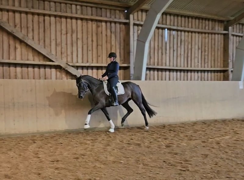 Damour is a stylish and particularly easy-to-ride 3-year-old dressage mare with Hanoverian premium eligibility. This charming mare impresses with three very good basic gaits and is always well-behaved under saddle. She shows a willingness to learn and is also a lovely companion in daily handling. With a height of 1.66m, she is an ideal horse for ladies. She is blacksmith and trailer friendly, and compatible with herds. Top vet check available. Location: 27432 Basdahl For more information and to schedule a trial ride, please call directly at: 01520/3178971