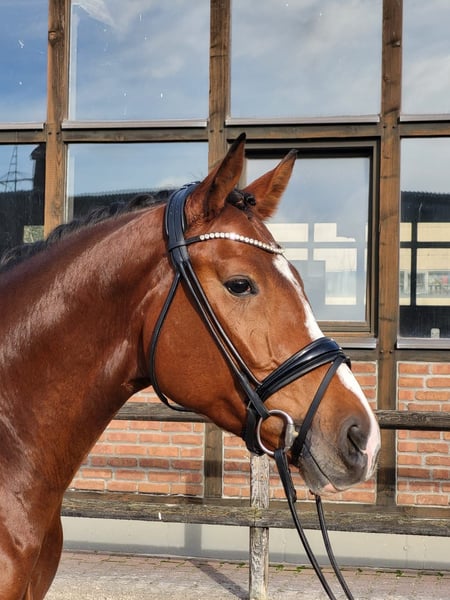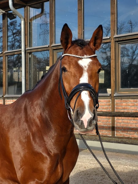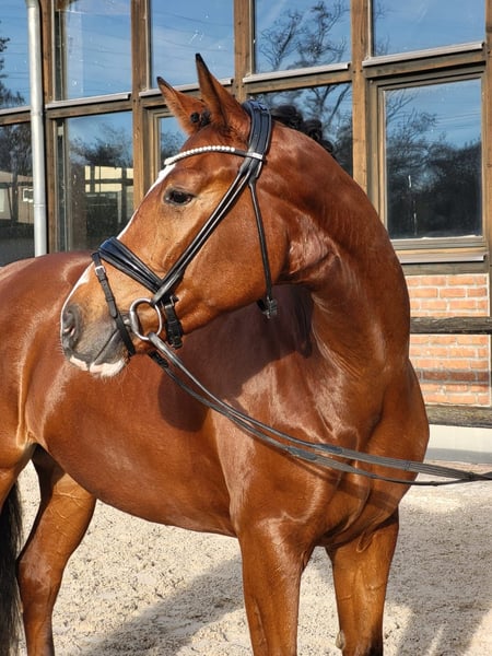 Stunning dressage mare with a distinctive appearance by Franco Nero out of a Lauris Crusador xx dam. She has three very good basic gaits: a lively, expressive trot with active hind legs, a canter always uphill with good balance and self-carriage, and a consistently regular, ground-covering walk. For her age, she is very confident and always well-behaved. She impresses with her high rideability and outstanding attitude. Always in good spirits, this mare delights everyone anew every day! Still in development, but a special dressage prospect is maturing here.