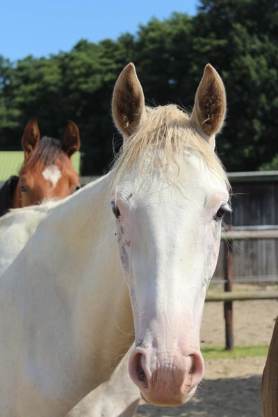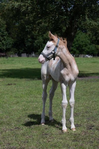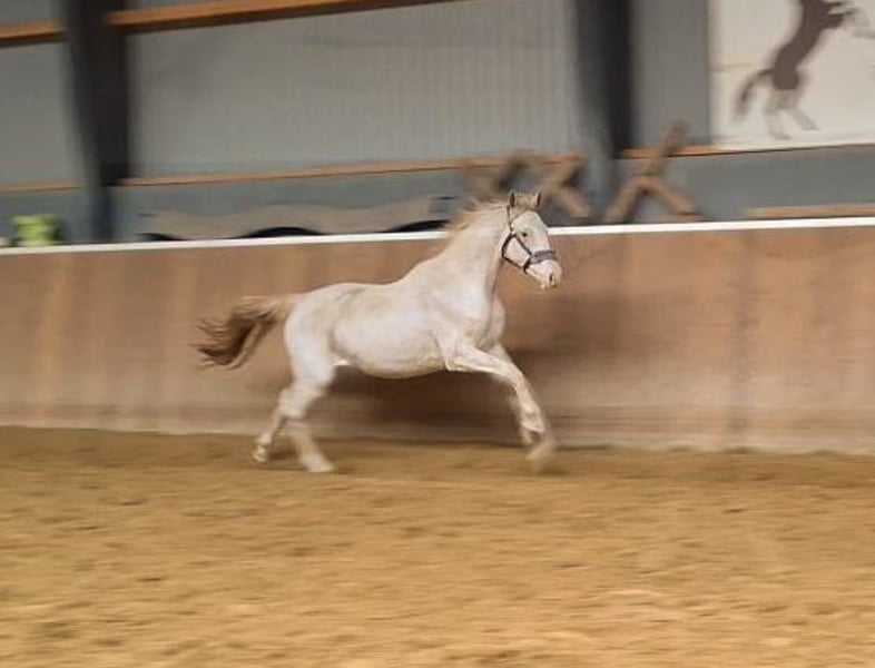 "Elfengleich vom Leisch" Born on June 19, 2023 Pedigree: Esquin White x Londonderry x Don Primero About the mare: "Elfengleich vom Leisch" is an exceptionally beautiful and promising young mare with a unique color change. Born as a pinto foal, she has developed into a delicate cream shade and now bears small brown spots – so-called "lucky spots." Her coat color may continue to change, making her especially interesting for enthusiasts of individual coloration. Since birth, she has been part of a large mare-foal herd and was socialized in a foal nursery with peers after weaning. She is familiar with halter handling, has been dewormed regularly, and has been introduced to the blacksmith. Her character is affectionate, curious, and open-minded. About the pedigree: Sire: Esquin White Esquin White is a licensed stallion with an impressive lineage. He is sired by Escamillo – Florencio – Relevant and was awarded special stallion approval in Vechta in 2022. His granddam, Celine, is responsible for the genetic variation that causes her unique coloring. She is a daughter of Rubinstein I – son Relevant, who, along with Lisa Wilcox (USA), was one of the most successful dressage sires of his generation and won team bronze at the Athens Olympics (2004). The subsequent generations of his pedigree include Holsteiners Cordeur and Landadel, as well as the Hannoveraner stallion Manstein, adding an interesting jumping component and noble bloodlines. Dam: Lilie (by Londonderry) Londonderry was an outstanding Hanoverian stallion, named "Hanoverian Stallion of the Year" in 2013. He was a successful sire with over 700 offspring, of which 92 achieved wins or placings in advanced classes. Londonderry was renowned for his exceptional movement and willingness to perform. Our main priority is a loving and suitable home. The price is negotiable – serious inquiries will be met with a fair solution! Fair offers are very welcome / negotiable If you are interested or have questions, please feel free to contact me. A personal visit is possible at any time by appointment. We look forward to hearing from you!