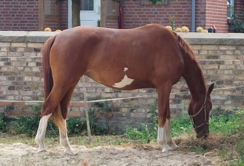 For sale, due to personal reasons, this striking mare. She is still completely untrained. Pedigree: Shu Fu x Dauphin Height approximately 1.70 m Fully vaccinated against tetanus, influenza, herpes, and West Nile virus. Feel free to come by and meet this people-oriented mare! Phone: 0160 2972603, WhatsApp is also possible.