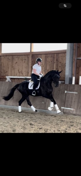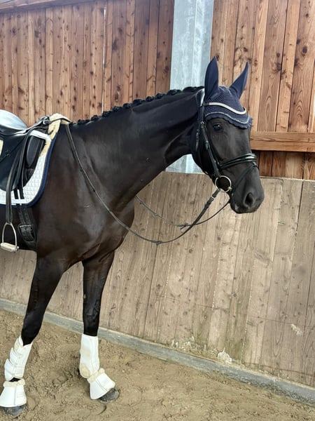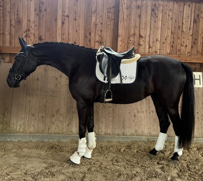 This typy, 3-year-old Hanoverian black mare (Fürst Toto x San Amour x Belissimo) is looking for her perfect person. She is currently about 170 cm tall, modern in build, and moves with a lot of quality: a very good, elastic trot, a powerful, uphill canter, and a secure, clear walk characterize her. Under saddle, she already shows herself to be extremely light-footed, motivated, and pleasant to ride – hardworking, but never over-excited. She can also be ridden by well-riding teenagers and provides a good feeling. She enjoys working and always presents herself as calm and friendly. She has also been out in the field, both alone and in a group. Even in unfamiliar surroundings, she is very well-behaved and always wants to please the rider. In free jumping, she shows talent, with good jumping technique and ability. We are just starting with jumping under saddle, and she has mastered her first pole training with flying colors. In daily handling, she is uncomplicated, and she is good for the farrier and loading. X-rays are available and show no findings. Due to a deficiency, she is being sold below value. All further information is gladly provided personally. Trial rides possible at any time. A great, people-oriented young horse with an excellent pedigree and a lot of potential for dressage, leisure, or eventing.