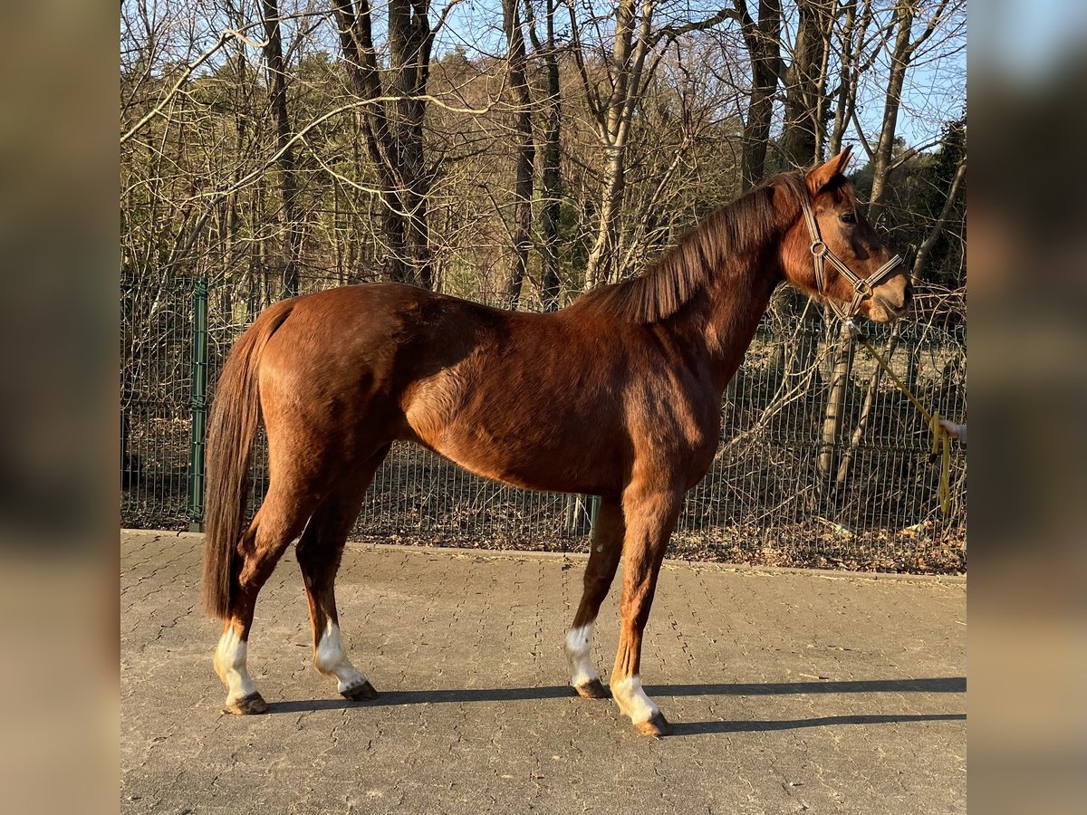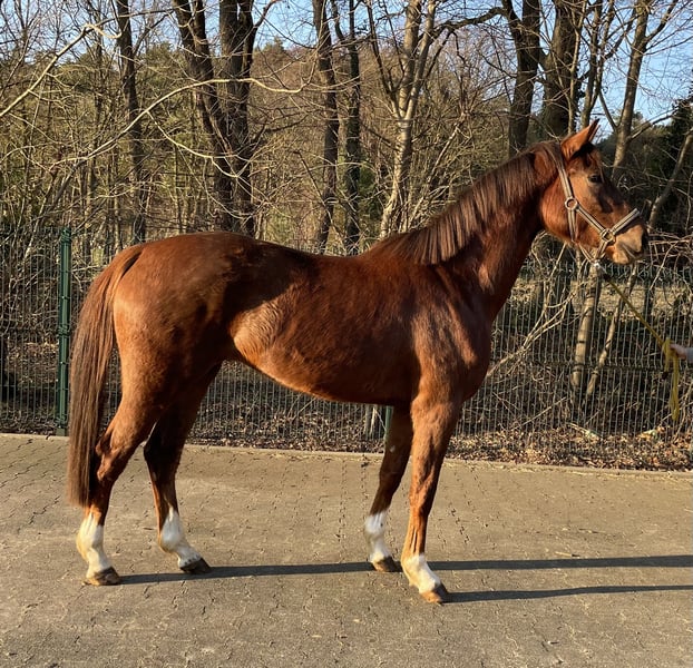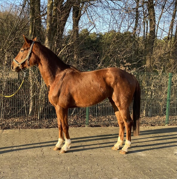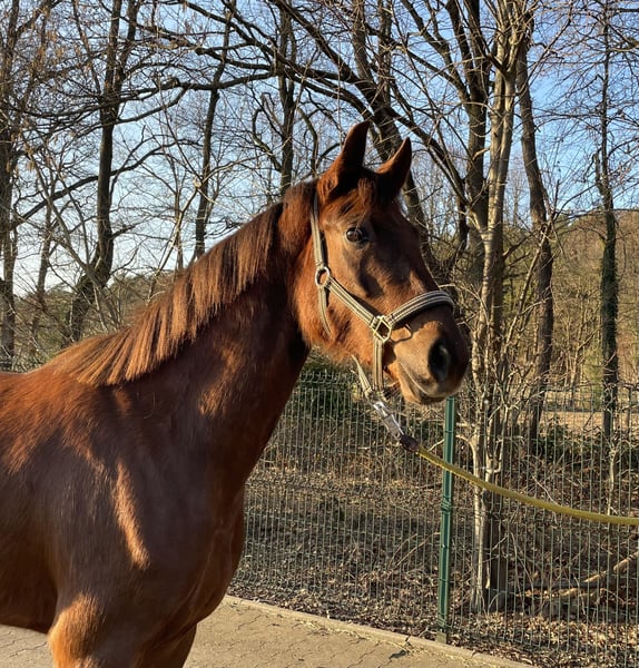 Wunderschöne jetzt 4-jährige Fuchs Stute mit einem bravem Charakter und drei guten GGA. Kennt noch nicht viel, das sie bis vor kurzem noch in einer Herde draußen lief. Super Abstammung und 1,63m groß zurzeit.