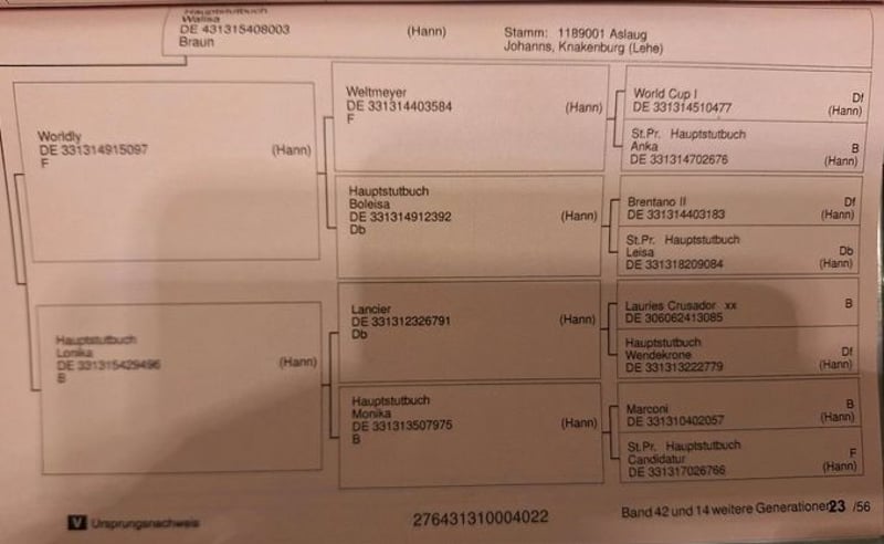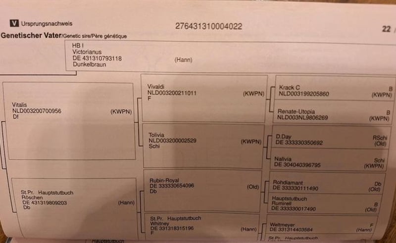 Nach reiflicher Überlegung und aufgrund einer OP im nächsten Jahr, beende ich meine Turnierkarriere nun mit 56 Jahren. Daher suche ich für meine menschenbezogene, mutige und absolut liebenswerte Stute VANUBIA den passenenden Deckel. Sie wird im April 4 Jahre alt, FN eingetragen, wunderschön mit einem traumhaft dicken Schweif. Ausgestattet mit 3 top elastischen GG und großer Schulterfreiheit. Die letzten 8 Monate habe ich sie mit Geduld und Ruhe an alles gewöhnt: Verladen, Spaziergänge inkl. Motorräder, Autos, Landwirtschaftliche Maschinen, Hühner und Alpacas (die immer freundlich angewiehert werden). Sie ist super menschenbezogen, total unstutig und einfach nur ein Schatz, egal ob Schmied oder TA. Von Juni - September unter dem Sattel im Schritt und Trab. Zuvor wurden die Zähne gemacht und sie wurde vom Physio behandelt, damit alles passt, bevor man aufsteigt. Sie ist extrem weich zu sitzen und angenehm in der Anlehnung, mit Vorwärts-Abwärts-Zug. Sie steht 24/7 in einem Offenstall in einer gemischten Herde, ist eher rangniedrig und total unkompliziert. Sie läuft barfuß, bei Spaziergängen durchs Gelände trägt sie vorne Hufschuhe. Ich suche jemanden, der dieses Top Pferd, das noch nie etwas Schlechtes erlebt hat, mit viel Geduld weiter ausbildet. Hat man "Nubi" auf seiner Seite, macht sie alles für einen. Sie ist schlau, gelehrig und will beschäftigt werden. Aufgrund des Ausbildungsstandes und eines aktuellen Wachstumsschubes ist ein Probereiten nicht möglich, anschauen, longieren, schmusen sehr wohl, weil sie nach dem Anreiten nun wieder auf der Koppel steht. Menschen mit Pferdeverstand, nicken gerade mit dem Kopf. So ein junges Pferd kann keinen Reittourismus vertragen. Ein TOP-Röntgentüv liegt vor. Sie ist väterlicherseits der erste Jahrgang des Victorianus. Ihr Opa ist der Top-Vererber Vitalis. Mütterliche Linie: Wordly/Weltmeyer. Sie wäre auch für die Zucht interessant. Sie ist dunkelbraun ohne Abzeichen. Aktuelles Stockmaß 161 cm. Geschätztes Endmaß 165/166 cm. Ein ganz feines elegantes Damen oder Jugendpferd. Ich verkaufe weder an Händler, Schulbetrieb oder Nachrichten wie: Ich geb Dir xxx und hol das Pferd gleich ab. Das ist kein Notverkauf. Sie verlässt mich nur, wenn ich das Gefühl habe, den richtigen Menschen gefunden zu haben. Näheres gerne persönlich.