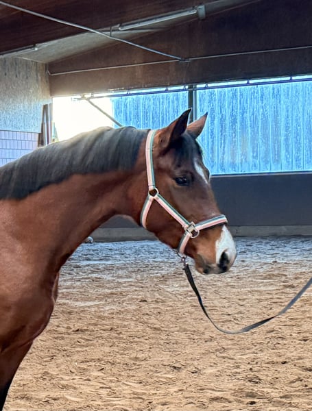 Zum Verkauf steht eine schicke 4 jährige Stute von Perigueux x Valentino. Die Stute wurde als Fohlen vom Züchter gekauft und ist auch dort weiter aufgewachsen. 3 jährig wurde sie schonend eingeritten und hat anschließend den Sommer auf der Weide verbracht . Nun ist sie wieder im Stall und langsam wieder im Training. Sie ist eine sensible und gehfreudige Stute. Im Umgang hat sie einen guten und einwandfreien Charakter . Die Springtechnik ist gut und schnell. Manchmal steht sie sich auf Grund ihrer Energie noch etwas selbst im Weg, aber dies bessert sich. Auf Grund von Familienzuwachs suchen wir ein gutes zu Hause für die Stute . Ein Züchter TÜV liegt bereits vor . Weitere Fragen gerne per Nachricht oder Telefon .