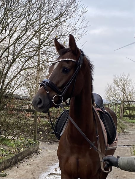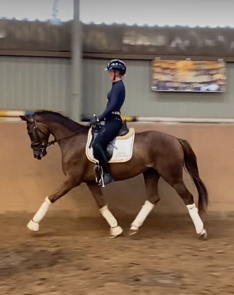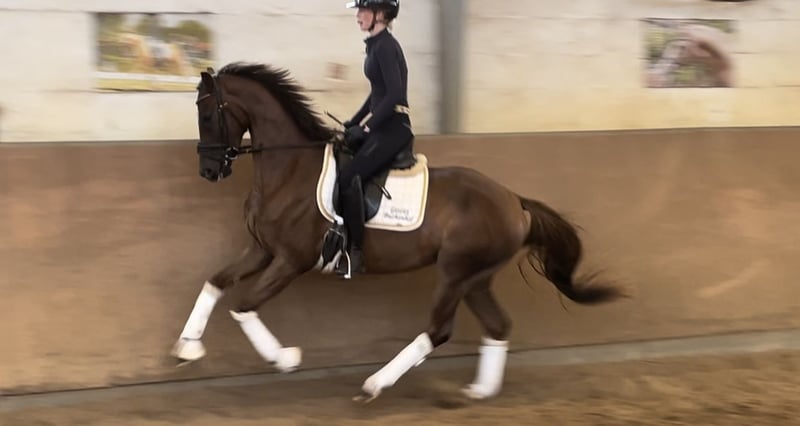 This Livaldon daughter impresses with her beautiful color and lovely face - simply stunning. Her mother is the successful state premium mare Quintessenz by Quaterback, who has excelled in dressage. Quintessenz is also a full sister to the Grand Prix successful Quite Right. Quibelle's rideability is outstanding; she always offers her cooperation with full motivation and enjoys her daily work. Super temperament and attitude. A training horse as one would wish! A comprehensive vet check is available, and the vet report is impeccable / in ideal condition (including neck and back). The mare is home-bred and has been raised under the best conditions and gently started under saddle. Quibelle knows the pasture and is absolutely fantastic in social interactions within the herd. Loading and outings are also totally easy.