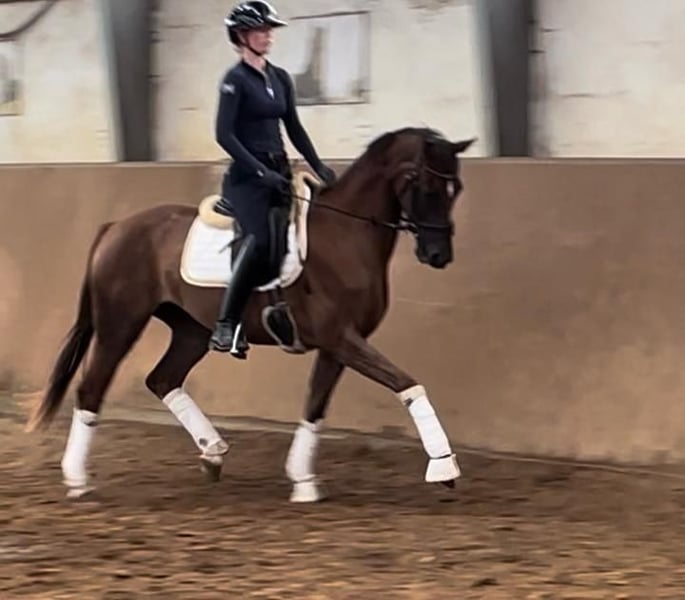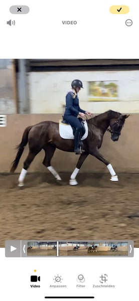 Cette fille de Livaldon se distingue par sa magnifique couleur et son joli visage - un vrai coup de cœur. Sa mère est la jument primée d'État Quintessenz, qui a connu le succès dans le sport équestre de dressage, fille de Quaterback. Quintessenz est également la sœur pleine du Grand Prix réussi Quite Right. La montabilité de Quibelle est grandiose, elle offre toujours sa coopération avec une motivation totale et prend plaisir au travail quotidien. Super intérieur et état d'esprit. Un cheval de dressage comme on le souhaite ! Un grand contrôle technique est disponible, le contrôle est impeccable / en état idéal (y compris le cou et le dos). La jument est issue de notre propre élevage et a été élevée dans les meilleures conditions de vie et a été montée avec soin. Quibelle connaît le pré - et s'entend parfaitement avec les autres dans le troupeau. Le transport et les sorties sont également très faciles.