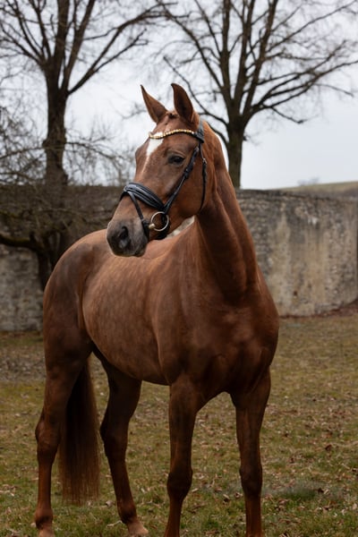 4- jährige Dunkelfuchsstute, ca 168 cm groß, Schmiede- und verladefromm, geländesicher! Abstammend von Bon Courage x Ampere Sie verfügt über drei gleichmäßig qualitätvolle Grundgangarten. Trotz ihres jungen Alters schon sehr brav und unerschrocken und absolut kopfklar- egal ob im Umgang oder beim Reiten ein wahrer Schatz. Eine tolle Arbeitseinstellung und Lernbereitschaft runden das Gesamtpaket ab. Sicher auch von Amateur zu reiten - es sollte jedoch Jungpferde Erfahrung vorhanden sein. Ein tadelloser TÜV inkl. Rücken, Hals und Genick liegen aktuell vor. Sie ist regelmäßig geimpft und entwurmt. Bei Interesse können Gerne Videos und weitere Infos verschickt werden - rufen Sie mich hierzu einfach an oder senden Sie mir eine Whatsapp Nachricht an: +49 15114938417