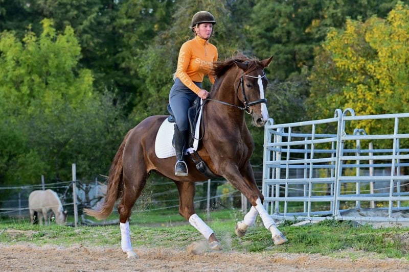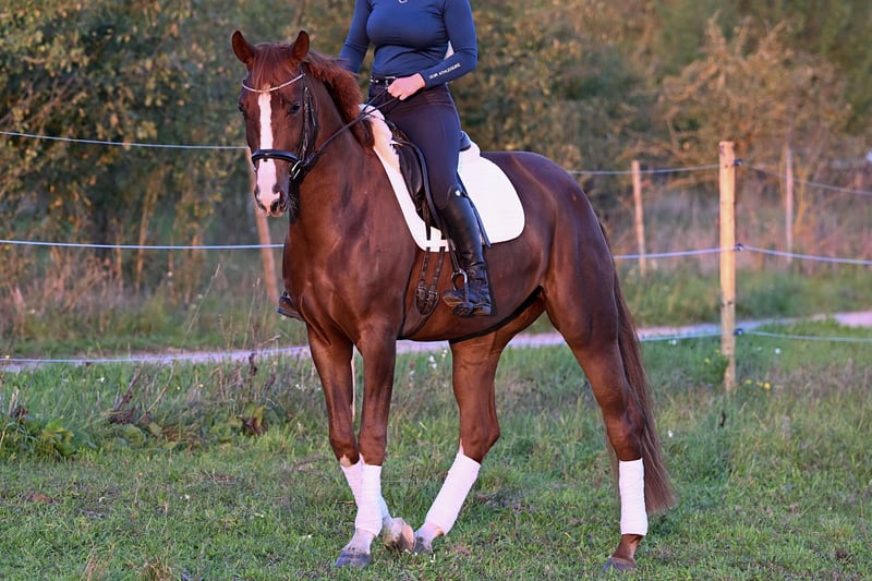 * V.: Rotspon x Donnerball - Donnerhall, Rosenkavalier, Florestan I, Rubinstein I, Weltmeyer, Focus… * 2021 geboren * Stute * zur Zeit 1,68m Stockmaß * Herdenvertraglich * Verladefromm * Schmiedefromm * von 15j. Jugendlicher geritten * im Gelände artig * unerschrocken * Würzburg * Transport gegen Aufpreis möglich * Beritt möglich * Große AKU für ca. 800,- * im Auftrag Diese Stute ist ein richtiger Hingucker. Totschick im schönen Dunkelfuchs Lack, mit einer herrlichen Aufmachung. Super artig im Umgang, lässt alles mit sich machen und ist sehr aufgeschlossen, freundlich und immer interessiert. Beim Reiten sehr angenehm zu sitzen. Gleicht einem Sofa. Sie ist sehr harmonisch zu reiten für die kurze Zeit unterm Sattel. Im großen und Ganzen ein unfassbar schönes Reitgefühl. Das Go muss sie noch ein bisschen üben. Der Schritt ist wirklich sehr gut, im Galopp zeigt sie immer wieder eine schöne Bergauf Tendenz. Es wird aber kontinuierlich besser. Sie wurde schon von einer 15 j. Jugendlicher geritten und war schon ganz brav alleine und in der Gruppe im Gelände. Es werden nur ordentliche Anfragen mit ernsthaftem Interesse beantwortet. Auf unverschämte Anfragen wird nicht eingegangen. Für das Probereiten nehmen wir 25,-, welches beim Kauf verrechnet wird. Anfänger nur mit Begleitung des erfahrenen Trainers. Preis steigt entsprechend der weiteren Ausbildung.