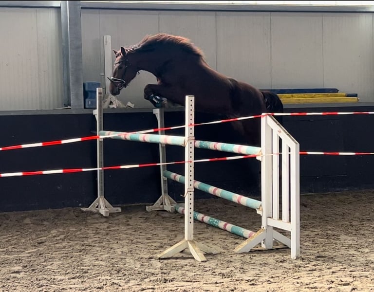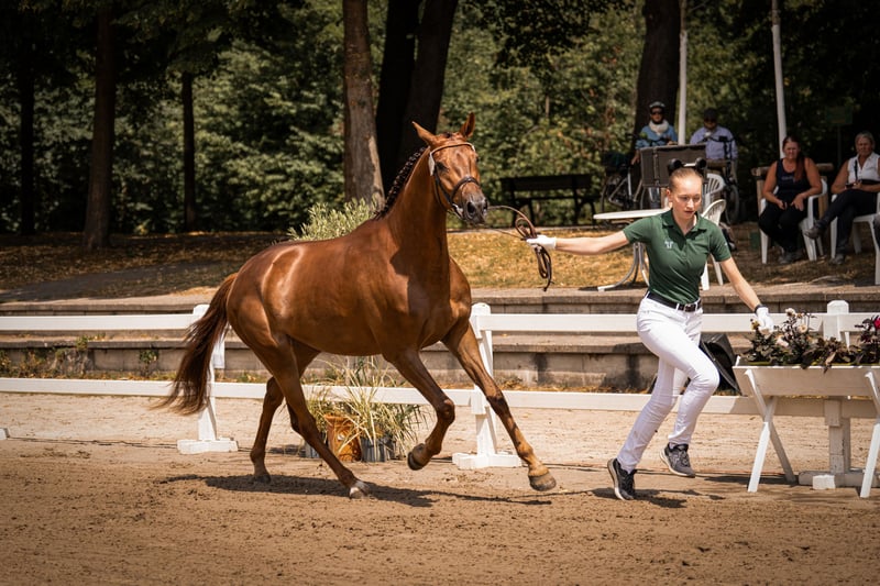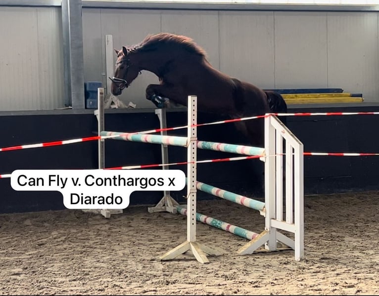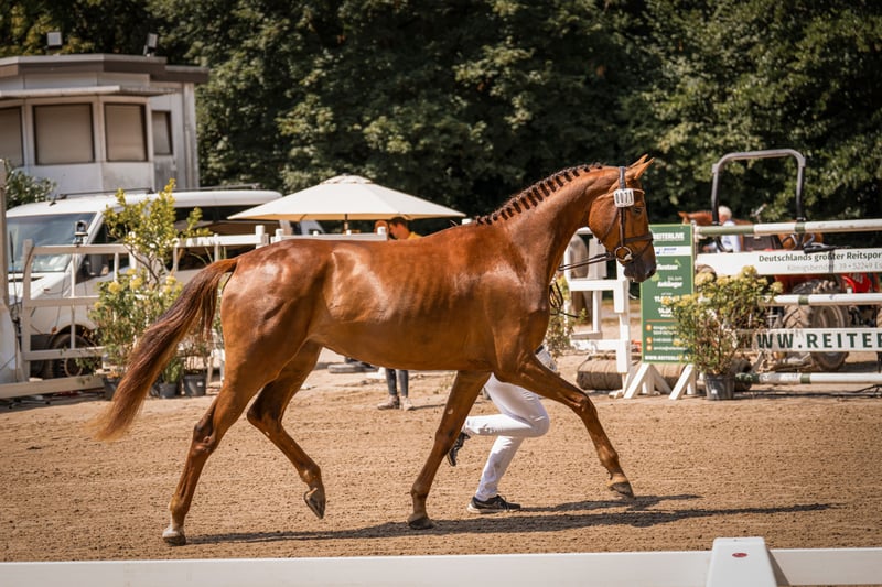 3 jährige springgewaltige Stute IA Prämie Staatsprämienanwärterin (als Fohlen Fohlenchampionesse/Goldprämie) Bildschöne Dunkelfuchsstute K.C. Can Fly von Conthargos aus der Springleistungsstute K.C. Diana. Voraussichtliches Endmass 170. Geb. 20.03.22. K.C. Can Fly ist ein Embryotransfer, sodaß die Stute auf dem Fotos nicht die Mutter ist. Die Mutter Diana ist im Springen M platziert und derzeit im Training fuer 150 cm springen. K.C. can Fly war auf dem Fohlenchampionat in Wickrath die Championesse der springbetonten Fohlen. Urteil der Jury: "Schöner und besser geht nicht mehr." Ihre Vollschwester Carrera (Rappstute) hat am 9.8. auf der Fohlenschau in Wickrath ebenfalls die Goldprämie erhalten (beide Stuten sind Embryotransfers). Anläßlich der Stutenleistungsprüfung inWickrath erhielt sie die IA Prämie mit Staatsprämienanwartschaft. CanFly kann nun auf die Turniersaison 2026 vorbereitet werden.