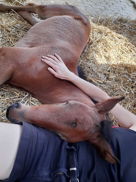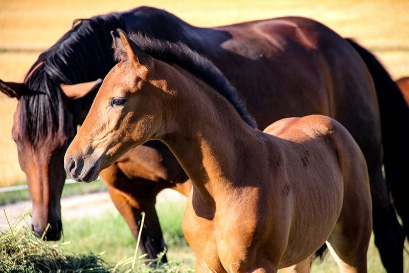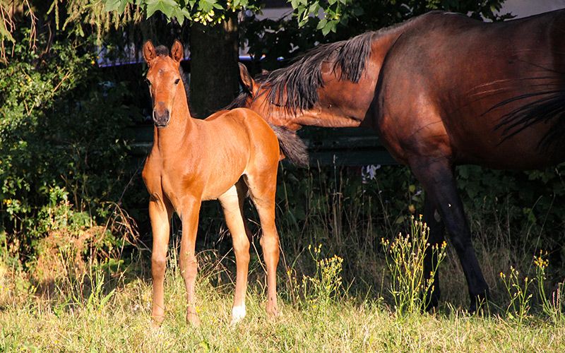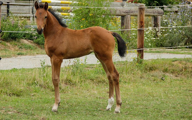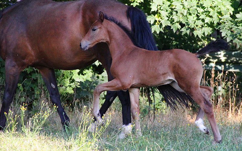 Fünf Sterne S von Freigeist a. d. Londontimes Lola S v. Londontime Hanoverian mare | Brown | 15.06.2022 born The name says it all. This beautiful, lively filly has a movement quality in a class of its own. Light-footed, with a lot of energy, it shows great movement dynamics with a very good uphill tendency. With a lot of thrust from the hindquarters, she just floats over the court. She has a lot of energy and fun moving. All three basic gaits are of exceptional quality. This typey filly is smart, self-confident and people-oriented, she has learned the foal ABC in a playful way, worm curing, leading or introducing herself to the blacksmith is no problem with her. She grew up with us on the farm. The horses are in the herd 24/7 on pasture in summer and in group exercise in winter. The dam mare has a height of a good 170 cm, so we expect a final size of the foal of 1.60 m / beginning 1.70 m. We run a small breeding. All horses have family connections, are people-oriented and are raised and trained with a lot of knowledge and heart. The foals are weaned gently and carefully, the upbringing and training takes place with knowledge of the horse's and learning behavior with a lot of love and without coercion. The foal is placed in suitable, supportive hands. When selling, we prepare the foal for separation and transport, which means we need a bit of lead time - buying today, picking up tomorrow will be difficult. There is also the possibility that the foal will stay here for rearing. The sire Freigeist (by Foundation) belongs to the young stallion stock of the Lower Saxony State Stud and was recently awarded the World Meyer Prize. You can find more information about breeding and rearing on our website schroetershof.de or give us a call.