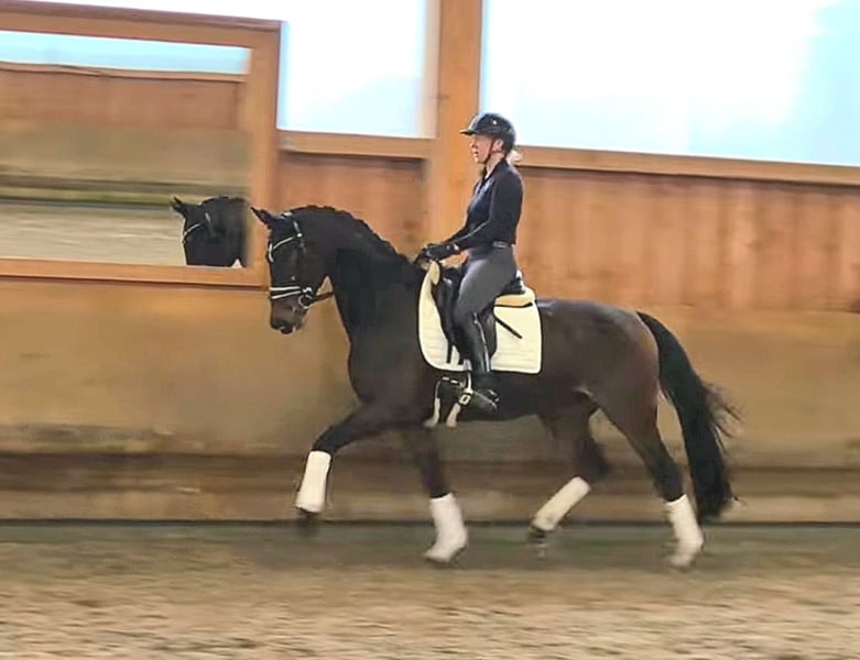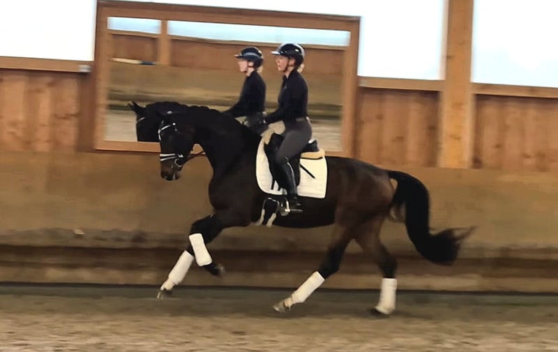 Elegant Hanoverian mare for sale – ideal for dressage! We are offering a beautiful dark bay Hanoverian mare, born in 2021. Standing at 16.1 hh, she has a compact and ideal size. She is well-suited for dressage and demonstrates great talent and willingness to learn. This talented young mare impresses with her elegant appearance, friendly demeanor, and promising movement. She has been carefully trained and is in good riding condition. If you are interested or have any questions, please feel free to contact me. Viewings and test rides can be arranged by appointment. Contact me for more information!
