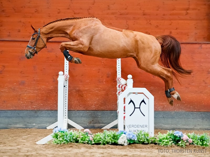 Das Pferd ist ein Verdener Auktionspferd und wird am 18.04.2026 onlive versteigert. Vom 6.04. bis zum 18.04. kann das Pferd jeden Tag beim öffentlichen Training besichtigt und ausprobiert werden. Das Startgebot bei der Versteigerung ist 8.000 Euro. Mit hochinteressantem Pedigree und sehr gutem Springvermögen ist dieser Youngster ausgestattet. Dalina präsentiert sich stets mit großem Eifer und viel Geschick. Der sportlich hocherfolgreiche Mutterstamm umfasst unter anderem Iron Dames Cydello v. Cascadello I (SPR: int. 1,55 m mit Richard Vogel), Dorian Red v. Drosselklang II (SPR: int. 1,45 m mit Thomas Weinberg), Captain Calido v. Calido I (SPR: int. 1,40 m mit Marcel Schneider) und Chadwick 6 v. Cranach (SPR: int. 1,35 m mit Elisabeth Kruse). 2. Generation Sportpferde Springen: Cydello/Iron Dames Cydello v. Cascadello I (SPR: int. 1,55 m mit Richard Vogel,Competition N°8 - CSI5*-W - 155cms Longines Trophy 2025,5 - Rolex Grand Prix Ville de Dinard 2025,LONGINES GCT GRAND PRIX 2025,1st GCL competition 2025,16 - Rolex Grand Prix Ville De La Baule 2025,CSI 4* GRAND PRIX 2025,CSI 3* GRAND PRIX 2025,Mannsch.-Springprfg.Kl.S**** m. 2 Umläufen -international- 2024,Springprüfung Kl. S -Großer Preis****- -international- 2024,Springprüfung Kl. S -Großer Preis***- -international- 2024,Nationenpreis Springen Kl.S**-international- 2024,CSI 3* GRAND PRIX 2024,CSI 3* Gran Premio 1.50 GNP 2023); Dorian Red 2 v. Drosselklang II (SPR: int. 1,45 m mit Thomas Weinberg); Chadwick/Chadwick 6 v. Cranach (SPR: int. 1,35 m mit Elisabeth Kruse). Aufbauprüfungen Springen: Calano 8 v. Comte (SPR: L); For Evita v. Forsyth (SPR: L). gekörte Hengste: gek. Hengst Dorado TK Z v. Diarado (Vechta 2025). Auktionspferde: Vanity Affair v. Valentino (FoVA 2009); Corvette v. Cranach (FoVA 2005). 3. Generation Sportpferde Springen: Captain Calido v. Calido I (SPR: int. 1,40 m mit Marcel Schneider); Alison/Alison 6 v. Argentinus (SPR: M mit Simon,Heinfried). Aufbauprüfungen Springen: Alemao 8 v. Argentinus (SPR: L). Auktionspferde: Ajana/Ajana 8 v. Acord II (FoVA 1995). 4. Generation Sportpferde Dressur: Ducati 6 v. Donatelli (DRE: Grand Prix mit Barbara Buhl,Dressurprüfung Kl. S*** - Grand Prix de Dressage 2013,Dressurprüfung Kl. S*** - Grand Prix de Dressage 2013); Falkenauge 6 v. Falkland (DRE: Grand Prix mit Meike Christmann,Dressurprüfung Kl. S- Grand Prix de Dressage 2006,Dressurprüfung - Grand Prix 2005,Dressurprüfung - Grand Prix 2005,Dressurprüfung - Grand Prix 2005); Random B. v. Rock Forever I (DRE: S*** mit Werner Bergmann); Dr. Mo 2 v. Destano (DRE: S** mit Ramona Müller); Fantastic Willy 3 v. Fahrenheit (DRE: S* mit Annalena Quathamer,Deutsches Amateur-Championat Dressur 2025); Brenda Lee 14 v. Belissimo M (DRE: S* mit Heinz Baumann); Destination 17 v. Desperados (DRE: S* mit Sophia CALVE); Falkana/Franziska 100 v. Falkland (DRE: S* mit Dierk Groth); Lyonel Dry v. Livaldon (DRE: S mit Carlotta Schüren,VA 2020); Divinio Gold v. De Niro Gold (DRE: M* mit Viola Abrahams); Top Louis v. Top of Class (DRE: M mit Büsgen,Dirk); Feivel 64 v. Falkland (DRE: M mit Becker-Gröschel,Sabine). Sportpferde Springen: Desmona/Desmona 2 v. Diskus (SPR: S mit Heidenreich,Joachim); VbPrA Amira/Amira 257 v. Chambertin (SPR: 1,35 m mit Stefania BESSIOU); Callista/Callista 10 v. Chambertin (SPR: 1,30 m mit Celina Makowei); Lamonte 3 v. Lortino (SPR: 1,30 m mit Andrea Wissing); Anjina/Jerry-Lee 3 v. Justinian (SPR: M mit Elmar Voitl). Sportpferde Voltigieren: Alexa 385 v. Don Marco (Voltigieren: S mit Amelie Rusczyk). Aufbauprüfungen Dressur: Millie Mae v. Martinez (DRE: M mit Svenja Nadine Lemke); Lance Armstrong 4 v. Londontime (DRE: M mit Esther Maruhn,Dressurpferdeprfg. Kl.L Bundeschampionat 5 jährige 2013); Dario 118 v. Donnerhall (DRE: L); gek. Hengst Prince Noir/Prince Noir 2 v. Prince Thatch (DRE: L,Lentföhrden 1996,VA 1996). Aufbauprüfungen Springen: Elisto M v. Eldorado van de Zeshoek (SPR: L); VbPr I'm on Fire/I'm on Fire M v. I'm Special de Muze (SPR: L); Calestra M v. Calisto KSH (SPR: L); Lukas LB v. Laurencio (SPR: L); Greeny Ann/Geeny Ann v. Graf Top (SPR: L); Capahatschi v. Corradino (SPR: L); Schnuppe 17 v. Sion (SPR: L). gekörte Hengste: gek. Hengst Pik's Pride v. Pik Noir (Aachen 2000). Auktionspferde: Martin v. Martinez (FoVA 2017); Living Diamond 3 v. Livaldon (VA 2019); Limonada v. Livaldon (FoVA 2015); Dana v. Don Crusador (VA 2015); Barilla v. Buddenbrock (VA 2010); Pauline/Pauline 85 v. Pommery (VA 2001). Bes. Prämientöchter: HannPr Limonada S v. Livaldon; HannPrA Dike/Donna Lucia 24 v. Diarado; StPr Dingeling S/Dingeling v. Don Crusador; StPr Dominante v. Diskus. 5. Generation Sportpferde Springen: Corty v. Cavalier (SPR: M mit Heesen,Dörthe); ONYX 47 v. Wolfsburg (SPR: M mit MALECKI,MAREK). Mutter: Violett H. Prämierung: 1xIa. ZL: 10/3 Großmutter: Argrepina ZL: 17/11 ZSP: Stationsprüfung Reitpferd - Trab 6,50 Galopp 7,00 Schritt 7,00 ø Durchschnitt Rittigkeit 6,00 / ø Durchschnitt Springen 8,50