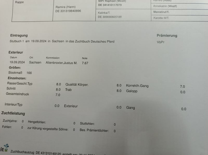 Sympathische umgängliche Verbandsprämienstute zum selbstausbilden zu verkaufen. Die Stute ist bereits seit 1,5Jahren bei mir und wurde zum züchten gekauft. Ihr erstes Fohlen wurde direkt Prämiert und nun ins EU-Ausland verkauft. Besamung,Geburt und Aufzucht verliefen Komplikationslos, jedoch hat sie dieses Frühjahr nicht aufgenommen und wird deswegen verkauft. Vor dem Fohlen saß bereits ein Reiter drauf ( nur aufgesessen im geführten Schritt) aber dies wurde nach erfolgreicher Besamung im letzten Jahr nicht weiter verfolgt und würde sich nun im Dezember nach dem Absetzen des Fohlens fortsetzen wenn sie bis dahin keinen neuen Besitzer gefunden hat. Wer also einen günstigen Diamanten zum selbstschleifen sucht ist hier richtig da mit entsprechender Ausbildung der Preis steigt. Sie darf ab Mitte /Ende November ausziehen. AKU kann gemacht werden und Transport ist ebenso unter Verhandlung möglich. Darf ab Mitte/Ende November ausziehen. Wird ab Mitte/Ende Dezember weiter gearbeitet wenn sie keinen neuen Besitzer findet.