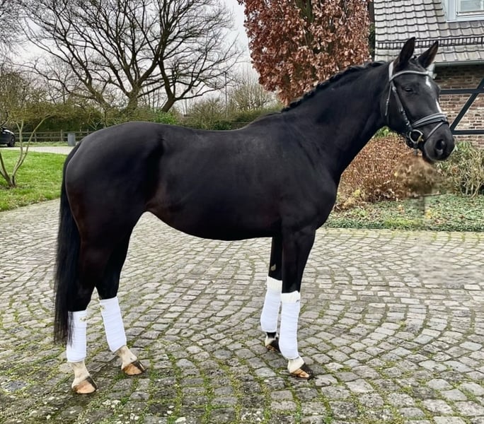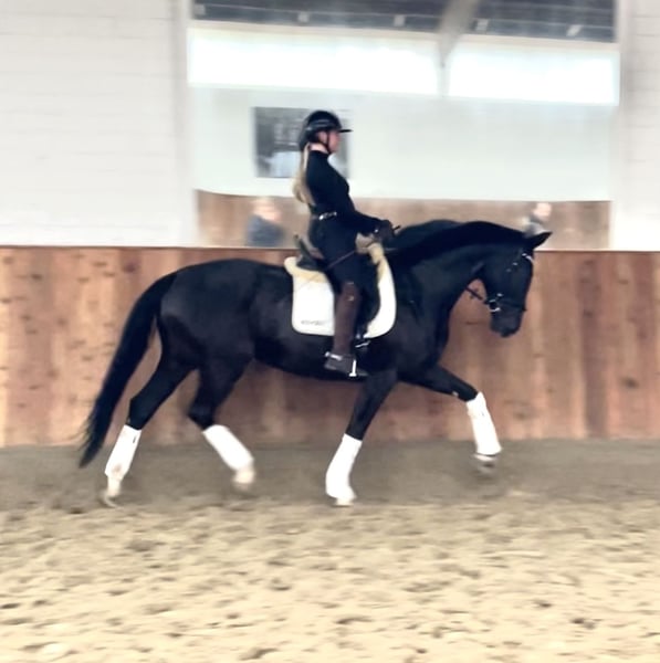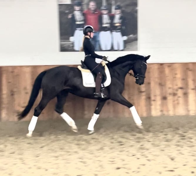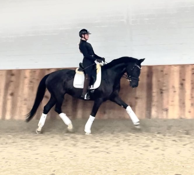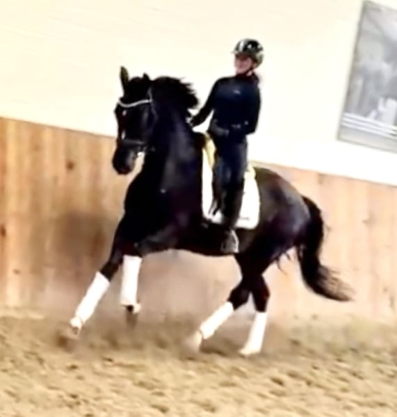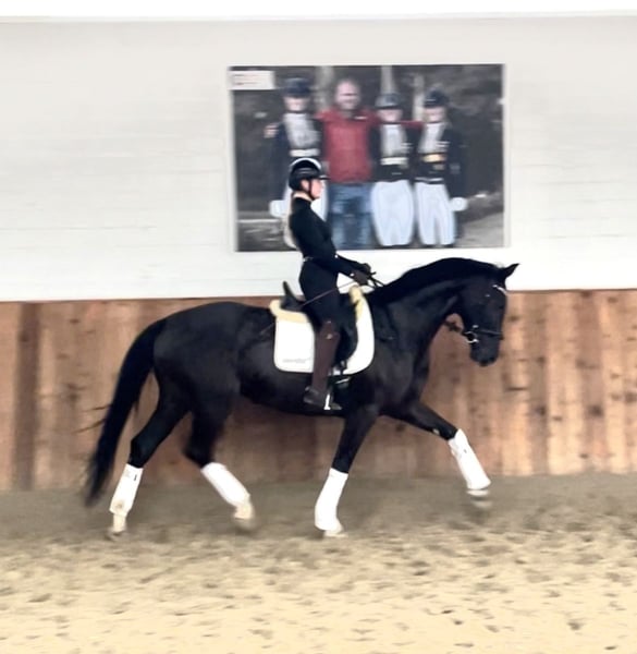 Khaleesi ist eine wunderschöne typvolle Rappstute vom Doppelweltmeister Kjento (Lottie Fry). Sie wird aus 1. Hand in beste Hände verkauft. Ein Stute, die durch ihre fantastische Ausstrahlung ein echter Hingucker ist. Sie befindet sich in einem der renommiertesten Ausbildungsställe in NRW und genießt hier die perfekte Ausbildung, die sich ein Pferd wünschen kann. Besonders hervorzuheben ist ihre Leichttrittigkeit und schöne Anlehnung – Khaleesi ist angenehm in der Hand und macht es dem Reiter leicht, sie korrekt zu fördern. So dass sie jetzt schon die L-Lektionen beherrscht. Auch einen fliegenden Wechsel bietet sie schon spielerisch an. Sie eignet sich perfekt für bereits gut reitende Jugendliche, um zusammen zu reifen. Sie begeistert mit einem taktsicheren Schritt, einem schwungvollen, aktiven Trab sowie einem bergauf gesprungenen, gut ausbalanciertem Galopp. Sie ist 5 Jahre alt, 1,70 m groß und befindet sich auf L Niveau. Sie ist draussen wie drinnen zu reiten und will immer alles richtig machen. Bocken und Steigen kennt sie nicht. Mit anderen Pferden sehr umgänglich, auch auf der Weide. Vater Kjento ist Doppel-Weltmeister der 6- und 7-jährigen Dressurpferde (Ermelo 2021 & 2022) und mittlerweile im internationalen Sport angekommen. Khaleesi’s Mutter war selbst hocherfolgreich in S Dressuren platziert und stammt aus bester Linienführung. Ihr Vollbruder ist sogar gekört. Ein guter Röntgentüv einschließlich Rücken liegt vor. Um dieses tolle Pferd zu schonen, wird eine Schutzgebühr für das Vorstellen/ Probereiten in Höhe von 50 Euro erhoben, die natürlich bei Kauf verrechnet werden. Standort: Krefeld / NRW