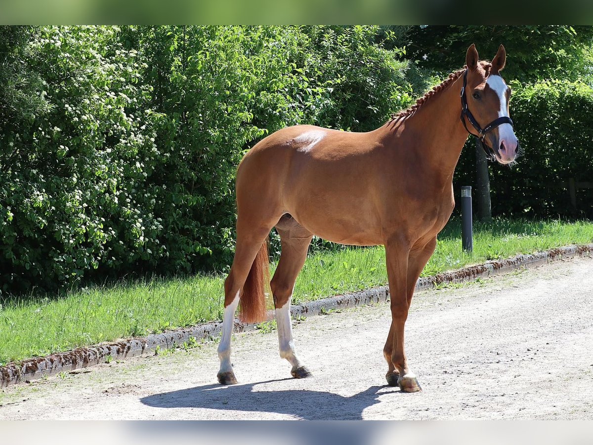 Seute Deern est une jument élégante, avec une taille d'environ 1,58 m, qui n'est pas trop grande et possède de bonnes allures. Nous l'avons achetée comme poulain, l'année dernière elle a eu un très beau poulain et à la fin de l'année dernière, elle a été montée pour la première fois. Elle a appris incroyablement vite et a déjà pu participer à des épreuves de saut d'obstacles lors de compétitions cette année. Lors des tournois, elle a montré une grande routine dès le début et dans le parcours, elle saute partout, que ce soit des murets, de l'eau, etc. Comme nous avons trop de chevaux et que notre fils n'arrive pas à la monter régulièrement, nous souhaitons maintenant la vendre uniquement à de très bonnes mains qui sauront l'encadrer. Elle est douce à manipuler, on peut facilement l'emmener en extérieur, elle ne craint pas les tracteurs, etc. Elle peut également être montée sans problème par des enfants, mais en raison de ses seulement cinq ans, pas par des débutants absolus.
