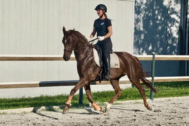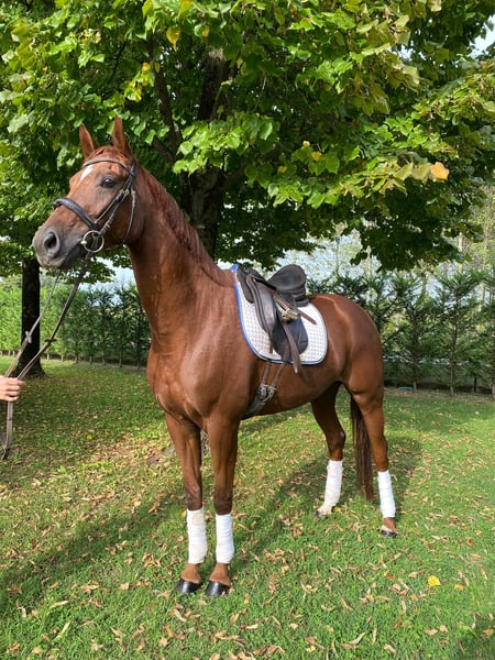 Valhalla is a 6-year-old mare, approximately 16.2 hh, by Don Noblesse out of Glamourdale. This elegant mare exhibits exceptionally good basic gaits, opening many doors for her in dressage. She has a lot of go, but with a skilled, sensitive rider, she is very manageable. She also shows a very good jump. Valhalla is a horse that requires consistent work and training and is therefore not suitable for beginners. She is both farrier and loading friendly. Valhalla is the perfect partner for someone who wants to grow in dressage with a quality horse and is willing to invest time in her further education. Additionally, she is a truly versatile talent and could also excel in eventing. Currently competing at Prix St. Georges level.
