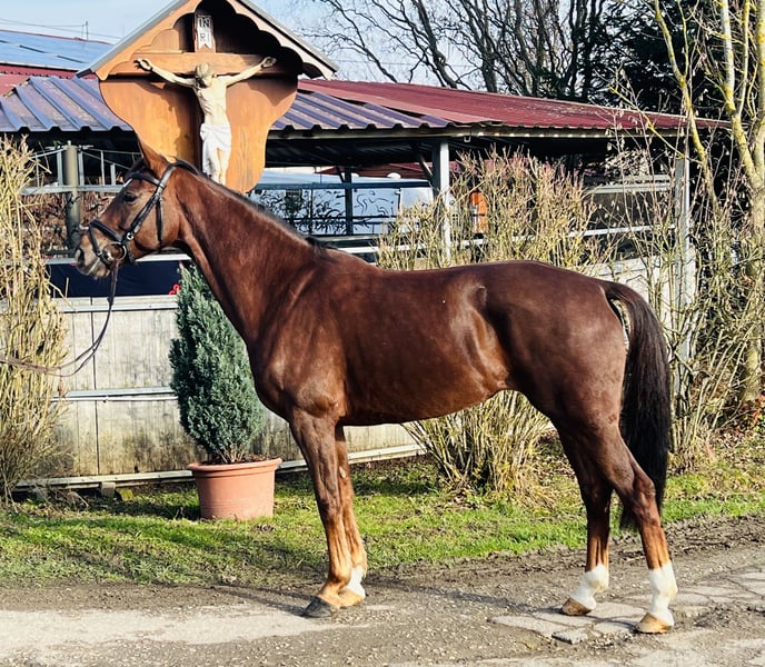 Donna ist eine wunderschöne Dunkelfuchsstute, die durch ihr Erscheinungsbild, ihre Gänge und ihre Allrounderqualitäten zu überzeugen weiß. Obwohl sie bisher noch nicht sehr weit ausgebildet ist, lässt sich schon erahnen, dass man definitiv etwas aus ihr machen kann. Auf Turnieren wurde sie bisher bis 1,00 m Parcours in Spanien platziert, liegt ihre größte Veranlagerung aber, wie die Abstammung schon verrät, in der Dressur. Weil sie noch nicht wirklich weit geritten ist, braucht sie eine sichere Hand in der weiteren Ausbildung und ist gerade deshalb auch preislich sehr interessant! Gute Röntgenbilder sind vorhanden. Sichern Sie sich dieses absolute Schnäppchen mit hervorragenden Qualitäten!! Wir freuen uns auf Sie! Sarah & Markus Pfeifer