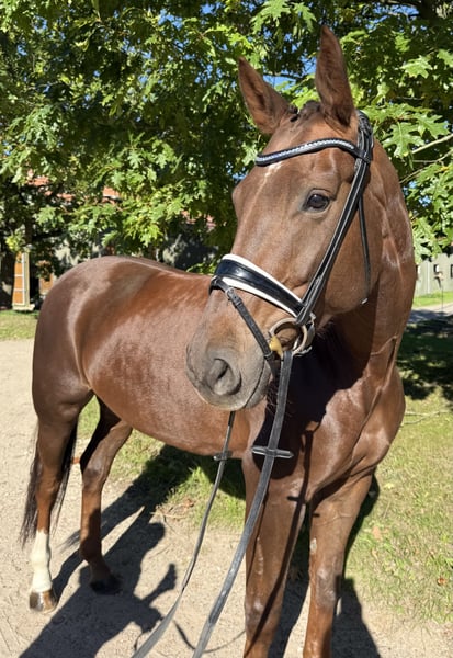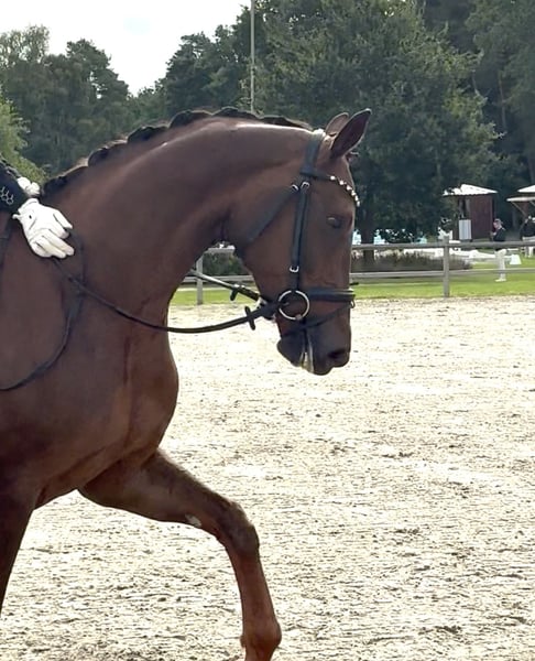 À vendre, cette exceptionnelle jument alezane foncé qui se distingue par sa qualité de mouvement impressionnante et son allure moderne. Elle possède 3 allures de base exceptionnellement bonnes et est très agréable à monter. Un cheval pour les cavaliers ambitieux et exigeants qui apprécient l'exclusivité, la qualité et le potentiel, tant dans le sport de haut niveau que comme perspective d'élevage future. • Âge : 6 ans • Taille : environ 168 cm • Origine : Don Martillo x Die Welt • Niveau de formation : Classée en dressage A • Caractère : Montable, motivée, sensible, attachée aux humains et agréable à côtoyer • Santé : Vaccinée et vermifugée régulièrement, sans anomalies à la radiographie (rapport vétérinaire actuel disponible) • Prix : sur demande Si vous êtes intéressé, nous serions ravis de vous contacter.