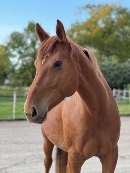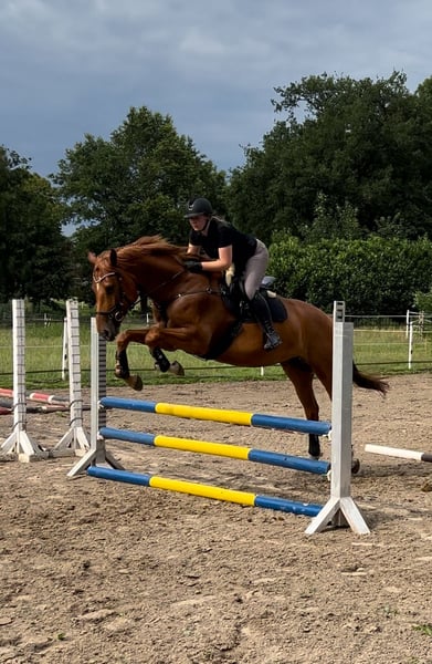 For sale is this nearly 7-year-old Hanoverian mare by Zinedream (Bonhomme Stud) out of a mare with Earl and Wildfang bloodlines, bred from my own stock. She was backed late and gently, and has shown herself to be very eager to learn ever since. Due to my lack of time, she is not yet fully trained, and a superficial injury to her front fetlock joint last autumn (healed, no deep damage, with X-rays of her front legs available) means she is currently not in work. She loves being pampered and is regularly groomed by children aged 7 to 10. She is gentle in handling, but still somewhat "shy" with new things – she also has limited experience in the everyday life of a riding horse. Under saddle, she is very willing and enjoys her work, but due to her limited experience, she is not suitable for beginners. Once routines are established, she becomes easy to handle and brave. She is familiar with various machines and different animals such as cows, goats, and chickens. I am selling her as a leisure horse, but she certainly has the potential to become a good lady or novice rider’s horse for competitions. Thanks to her wonderful temperament, especially with children, I also see her as an ideal family horse if someone experienced takes care of the foundational training. I am looking for a good home for her, so quality takes precedence over price. A trial ride is currently not possible, but she can be viewed at any time.