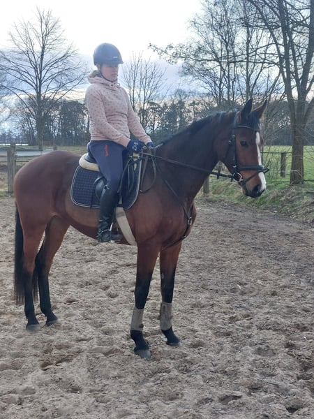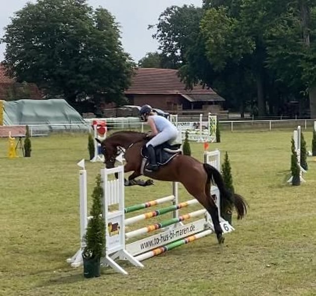 Zum Verkauf steht unsere 6jährige Hannoveraner Stute Carlotta von Casallco x Valentino. Im Frühjahr 24 schonend angeritten, zeigte sie sich von Anfang an ausgesprochen lernwillig und mit viel Freude an der Arbeit. Ausgestattet mit 3 sehr guten Grundgangarten und dem nötigen Go bringt sie sowohl für die Dressurarbeit als auch für den Springsport viel Potenzial mit. Am Sprung ist sie unerschrocken und motiviert. Auch auf ihren ersten Tunieren diesen Sommer zeigte sie sich sehr brav und schon recht abgeklärt. Wir wünschen uns für sie eine/n Reiter/in der/die sie weiter fördert und ihr ermöglicht, ihr sportliches Potenzial auszuschöpfen. Aufgrund ihres Alters und Ausbildungsstandes wird sie nur in erfahrene Hände verkauft. Wir verkaufen sie unter Wert, weil sie leider ein gesundheitliches Defizit hat, das sie aber bei entsprechender Haltung in ihrer Leistungsfähigkeit nicht einschränkt. Genaueres bei persönlicher Anfrage und ernsthaftem Interesse.