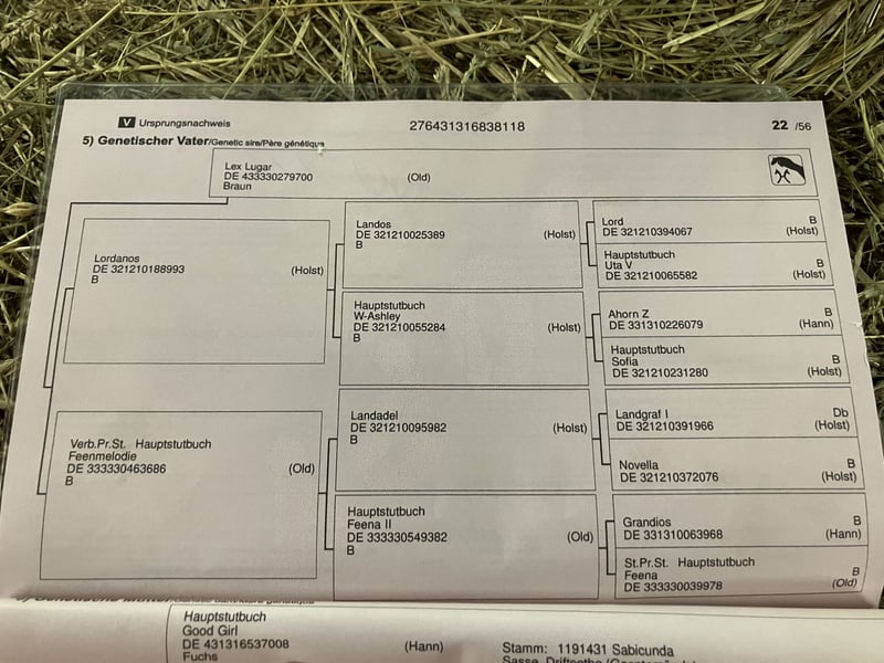 Lex Lugar x Garant Lex Lotta es una yegua alazana de 7 años, descendiente de Lex Lugar. Demuestra un gran talento y mucho entusiasmo por los saltos. Mide aproximadamente 1,71 m y en la manada suele tener un rango bajo. Es amable en su trato, aunque a veces puede ser algo terca y mostrar mucho temperamento en ciertas situaciones. Por lesión, Lotta ya no puede ser montada y no lo será en el futuro. Como esta yegua ha llegado a mi corazón, busco un hogar adecuado como caballo de compañía o yegua de cría, ya que su buena ascendencia Hannoveriana es muy prometedora. Si hay interés serio, estaré encantado de proporcionar más detalles. ¡Prioridad a la buena familia, no al precio!