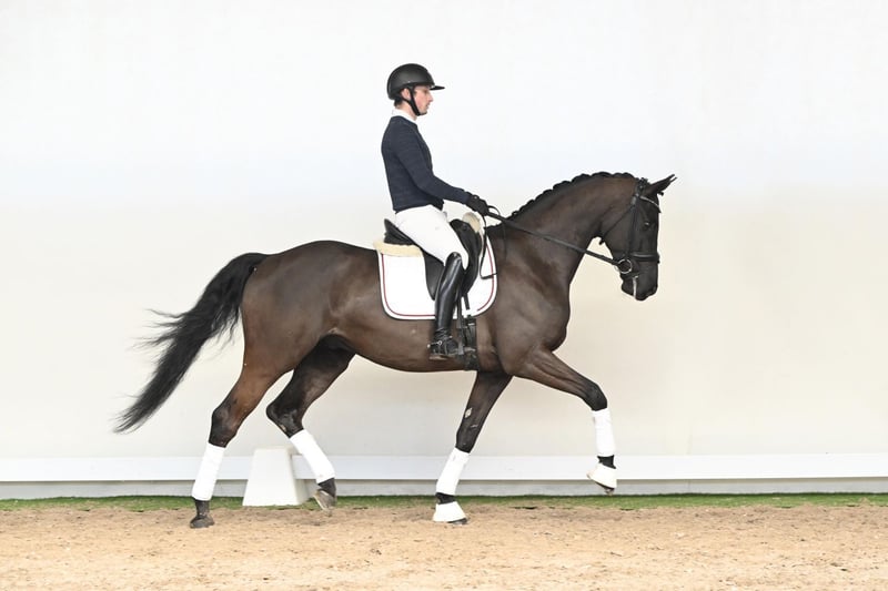 This 6-year-old gelding of ideal stature combines everything one could wish for in a modern dressage horse. With his perfectly proportioned frame and natural presence, he immediately captures attention in the arena and effortlessly draws in every spectator. He has already proven his quality with successful performances in competition. He consistently presents himself in excellent balance, with clear rhythm, elasticity, and natural suppleness throughout. Particularly noteworthy is his outstanding canter: powerful in the take-off, naturally uphill, and equipped with the scope and mechanics required for development towards advanced movements. His rideability is exceptional in every respect – responsive to the aids, attentive, and always thinking with his rider. A horse that understands his job and remains cooperative and a pleasure to ride at all times. Already placed in novice-level dressage horse classes, he stands out as a true gem with exciting future potential. His pedigree further underlines his quality: his sire, D’Egalité, celebrated champion stallion of the Westphalian licensing, impresses with elegance, light-footedness, and expressive movement up to Intermediaire I level. His offspring are renowned for their rideability, expression, and modern dressage type. On the dam’s side, Weltruhm – a son of the legendary Weltmeyer – contributes powerful movement dynamics, correct conformation, and proven performance genetics, complemented by a strong and internationally successful dam line. A horse for riders with ambition: talented, rideable, and unspoiled, with all the attributes required for a successful future in dressage sport.