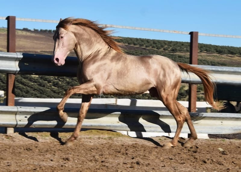 Ogier PRE w specjalnym kolorze, Bayo Perla (CrPrl), miły charakter z przyjemnym temperamentem, ciekawski, uważny, przytulny, zabawny, licencjonowany, stadnina od lutego 2024, ma już ponad 10 klaczy źrebnych, obecny wzrost 1,61 m, ostateczny wzrost 1,63-65 m, barokowy, piękny ruch, mieszanka hiszpańskiego i ujeżdżenia, ma dobre zdjęcia rentgenowskie i jest piroplazmoza negatywna, opłata stadna 500 €, znajduje się w prowincji Cordoba (Hiszpania).