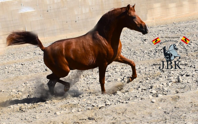 Hispano-Arabian POTOSI is looking for a new home This magnificent, purebred Hispano-Arabian stallion is a truly remarkable specimen of his breed. He moves with a lot of spirit and elegance, and he is very agile and expressive. I can well imagine Potosi in Working Equitation in the future. Under the Andalusian sun, his coat shines like fire. A dream horse that is also very sweet. He grew up in a herd at his home stud. He is still at home there, has never experienced anything bad in his life, and was raised sensibly with mineral supplements and deworming, as it should be. For anyone who would like to train such a treasure themselves: Here he is, Potosi. Born on 09.02.2022, currently 1.58 m tall.