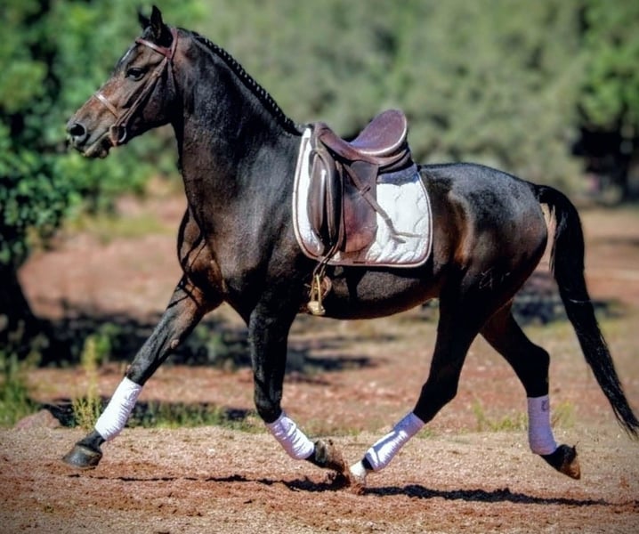 TROYA... a Hispano-Arabian gelding, is looking for his **forever home**. This stunning 7-year-old dark bay, standing at 16.1 hh, is perfect for the discerning leisure rider but also an ideal teacher for those re-entering the sport or for beginners. This elegant fellow impresses with his friendly nature and versatile suitability for leisure riding, dressage, or working equitation. He is very well-behaved in handling and extremely reliable in the field, bringing a wealth of experience to outdoor rides. In the arena, he is ideal for experienced riders seeking a noble, well-mannered, and balanced horse, but also suitable for novice riders who need a calm and steady partner. He prefers to go with a snaffle bit and is also trained in dressage with a double bridle. Troya adapts well to different training styles and can move forward confidently or softly and gently, depending on the rider’s needs. If this impressive black gelding appeals to you, please contact me with your phone number so I can get in touch as soon as possible. We always have a great selection of various Spanish horses, all from the best and most caring hands. For inquiries or more information, I am happy to assist. Visits can be arranged by appointment.