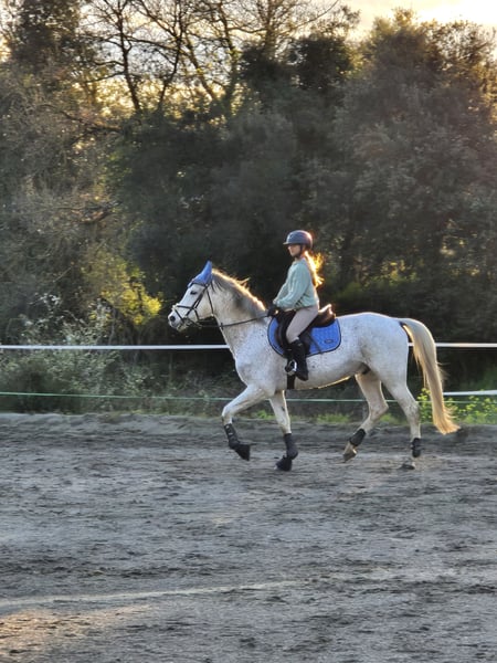 Nombre: Real Año de nacimiento: 2017 Altura: 1,62cm Capa: Tordo Vendemos a este cariñoso caballo de salto ya que necesita que su dueño tenga mas fuerza y experiencia. No es recomendado para principiantes. Salta entre 80-90cm y ha participado en varios concursos con su dueño anterior. Se porta bien al entrar y salir del remolque. Puede salir tanto al campo como en carretera y no se asusta fácilmente. Es un caballo tranquilo y de confianza, se porta bien ensillándolo y desmontando. Se lleva bien con otros caballos y se comporta bien en pista. ¿Quieres un caballo todoterreno en el que puedas confiar ? ¡Este es ideal !